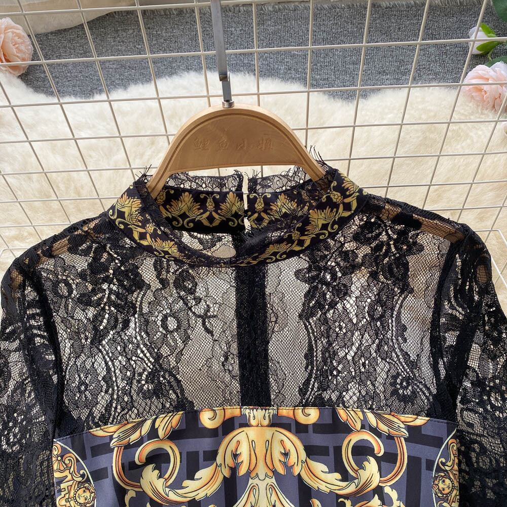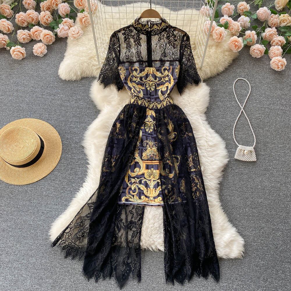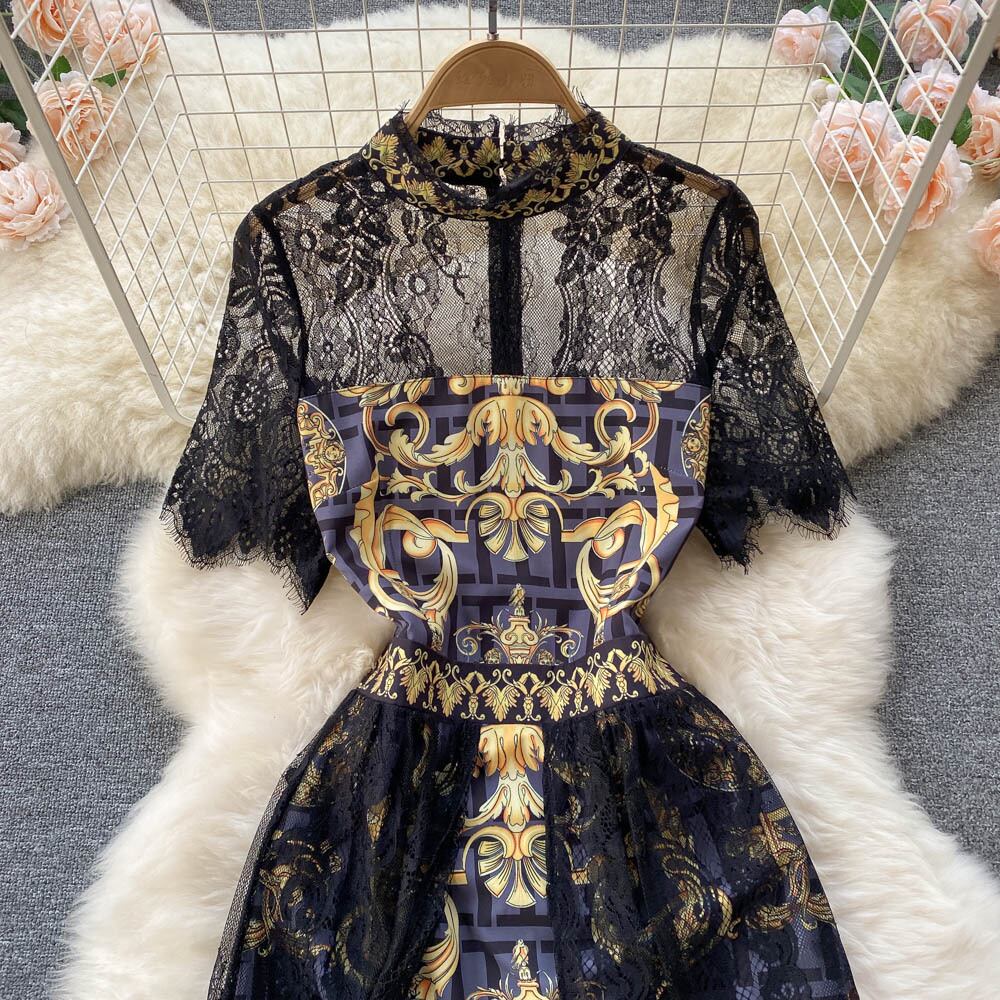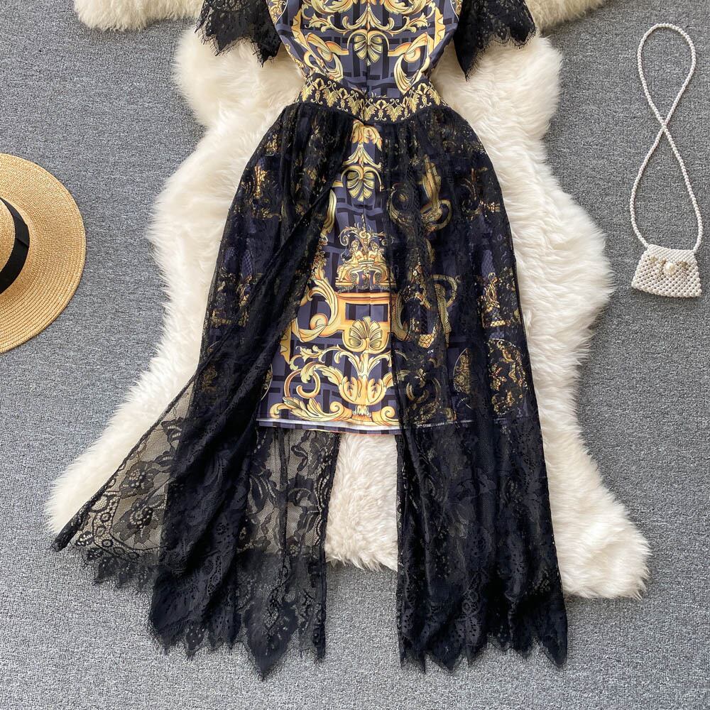 2022 spring and summer new retro print over the knee high-quality slim skirt short-sleeved waist lace stitching dress ニーハイ レトロ レース スプリング 春物 サマー 夏物 スカート スリム ステッチ lyxaj20260009646
