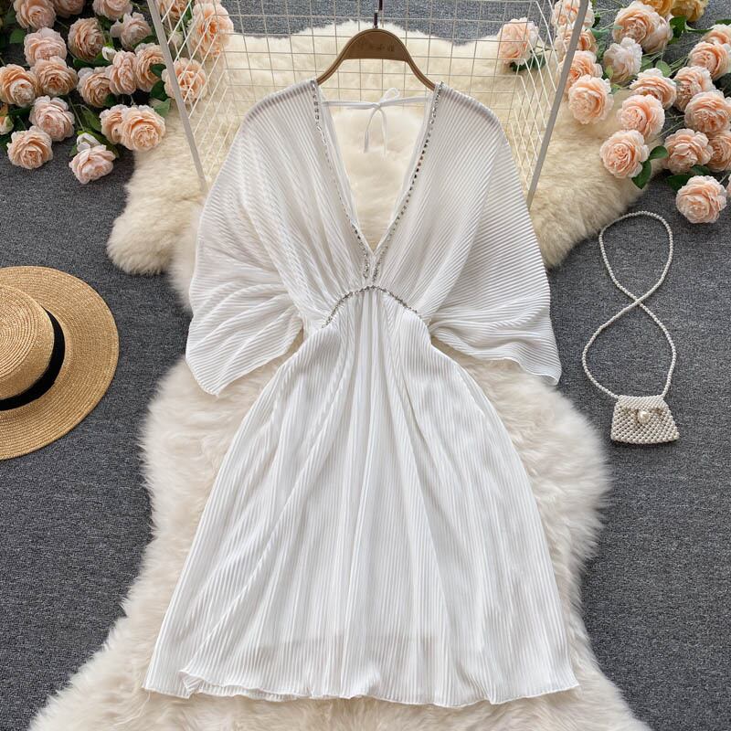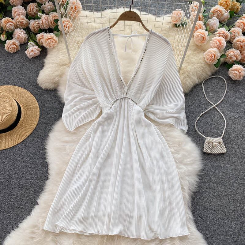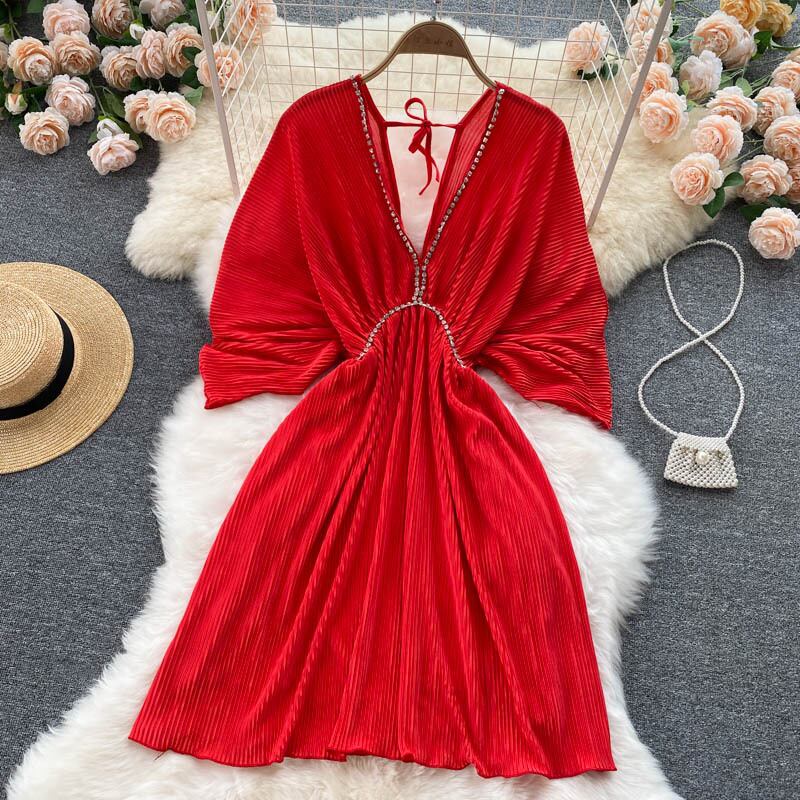 -end skirt European and beautiful women's summer new heavy-duty diamond-studded V-neck pleated slim bat sleeve dress women プリーツ サマー 夏物 スカート Vネック スリム ヨーロピアン lyxaj82705297791