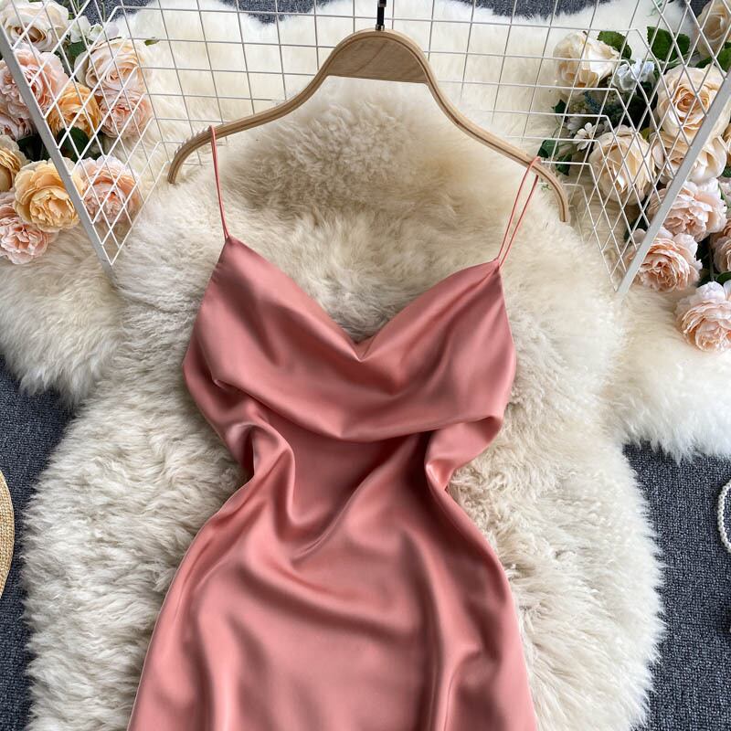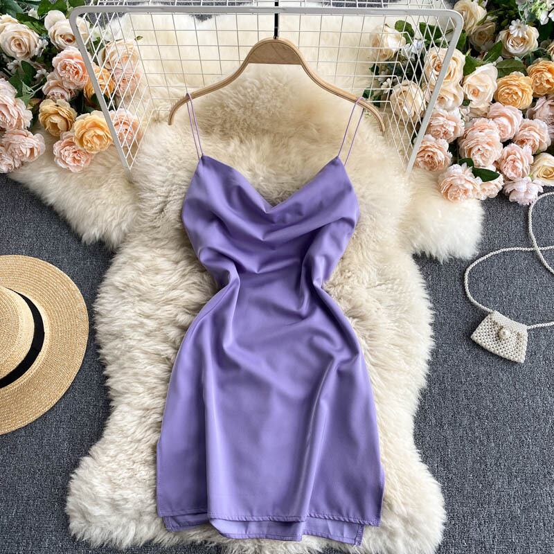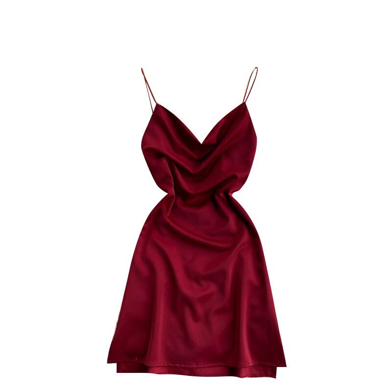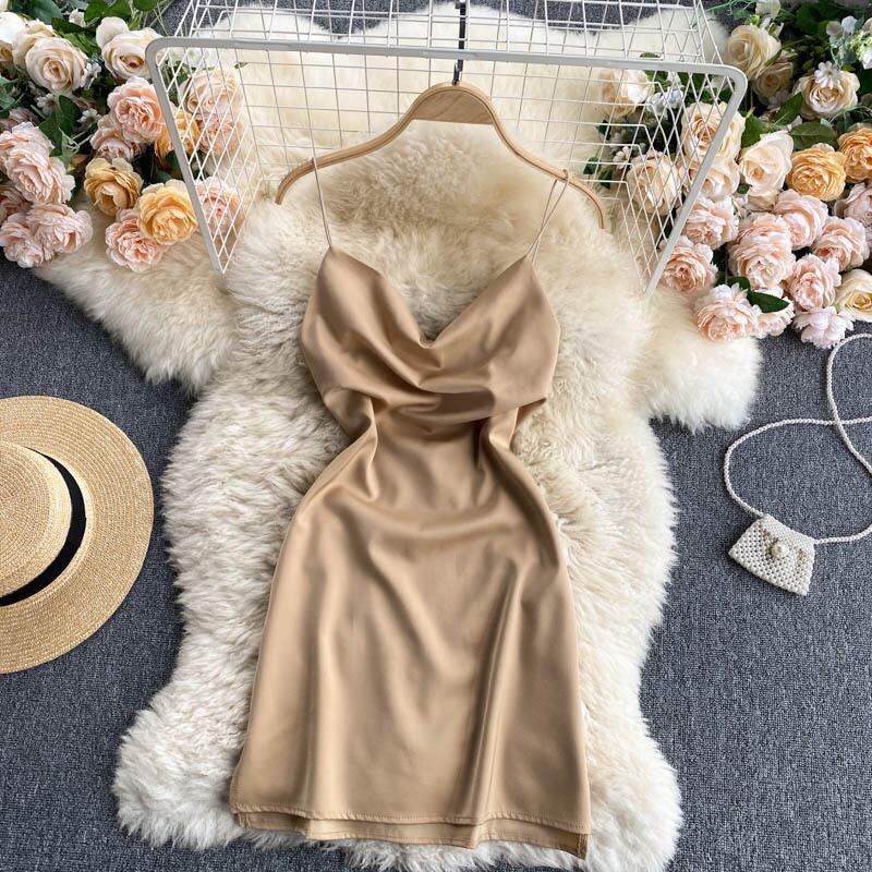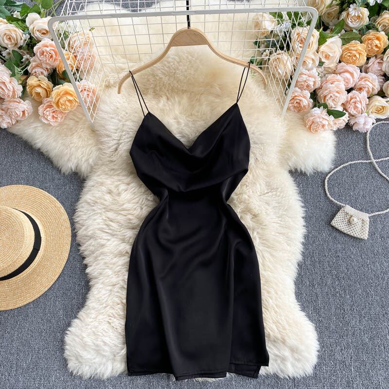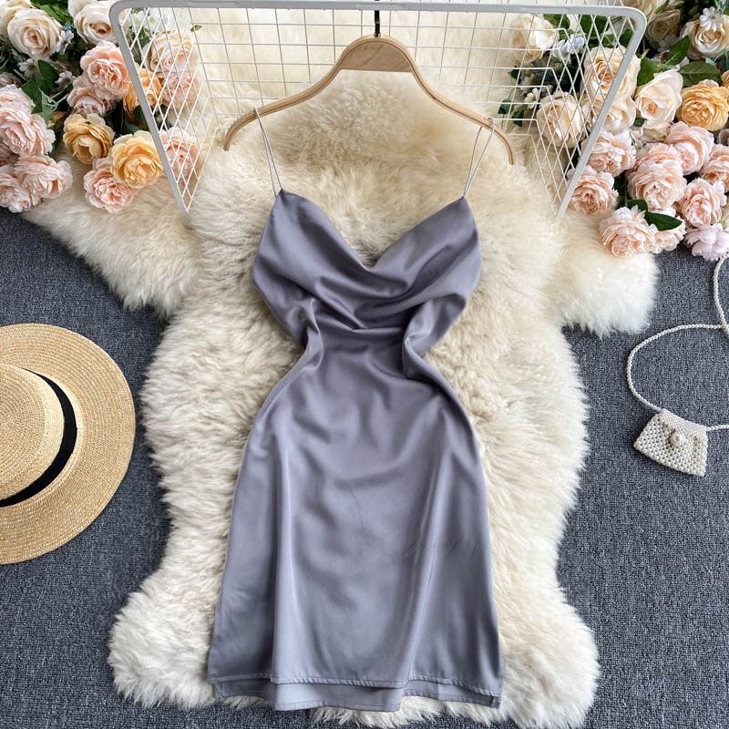 Feminine Dress 2021 Swing Collar Sexy Backless Slim Fit Short Satin Sling Skirt ショート スカート サテン スリム lyxaj42730403021