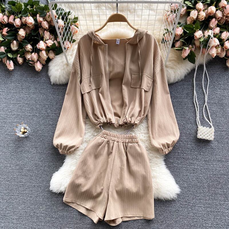 sports suit women's autumn new long-sleeved hooded zipper cardigan top elastic high waist shorts two-piece set ハイウェスト ロング エラスティック 伸縮 カーディガン オータム 秋物 ショーツ ブルマー lyxaj58511765928