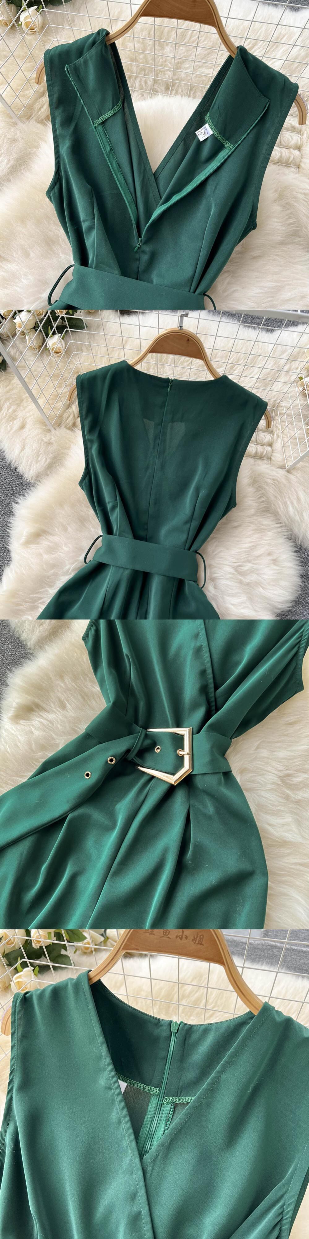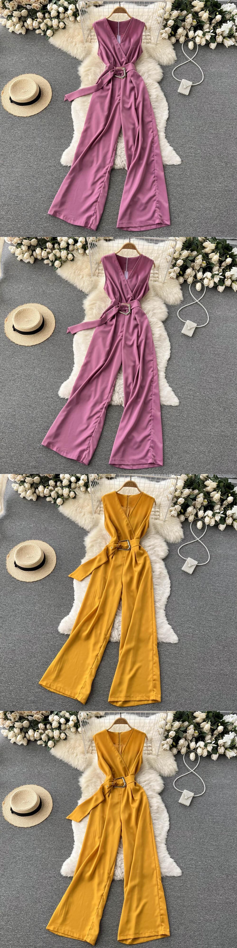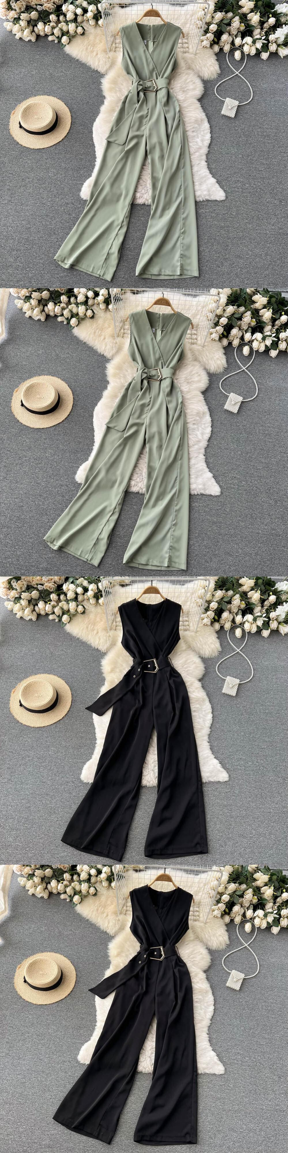 Celebrity OL version of fashionable temperament V-neck sleeveless jumpsuit with waist tie shows thin wide-leg trousers jumpsuit female ノースリーブ Vネック lyxaj65513002184