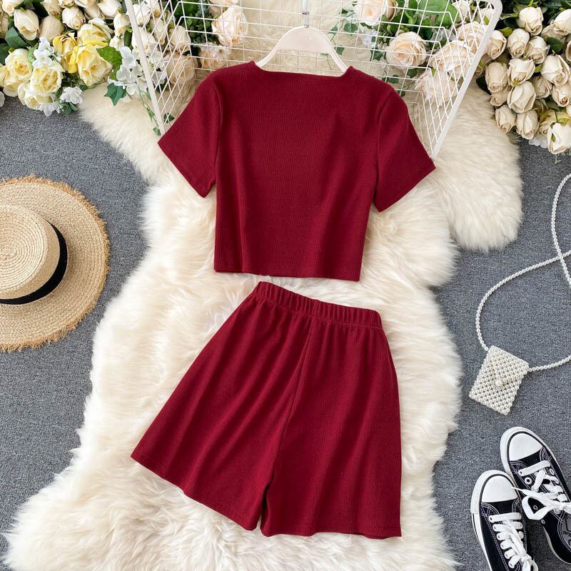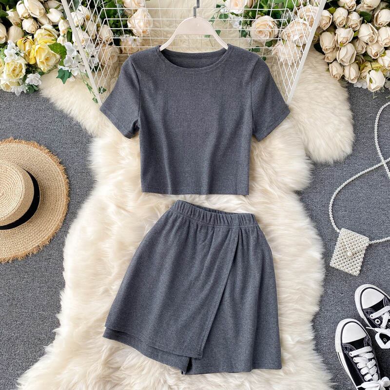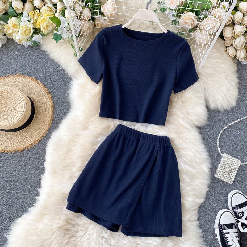 Short-sleeved T-shirt women's design sense fake two-piece wide-leg pants short skirt pants casual sports wind suit age-reducing two-piece ins ショート カジュアル スカート Tシャツ lyxaj22631471923