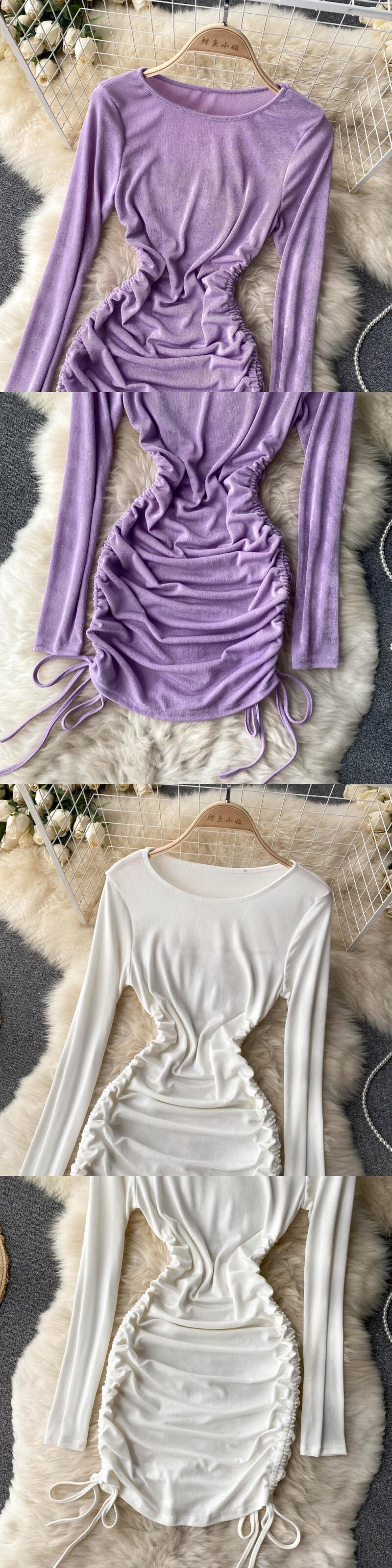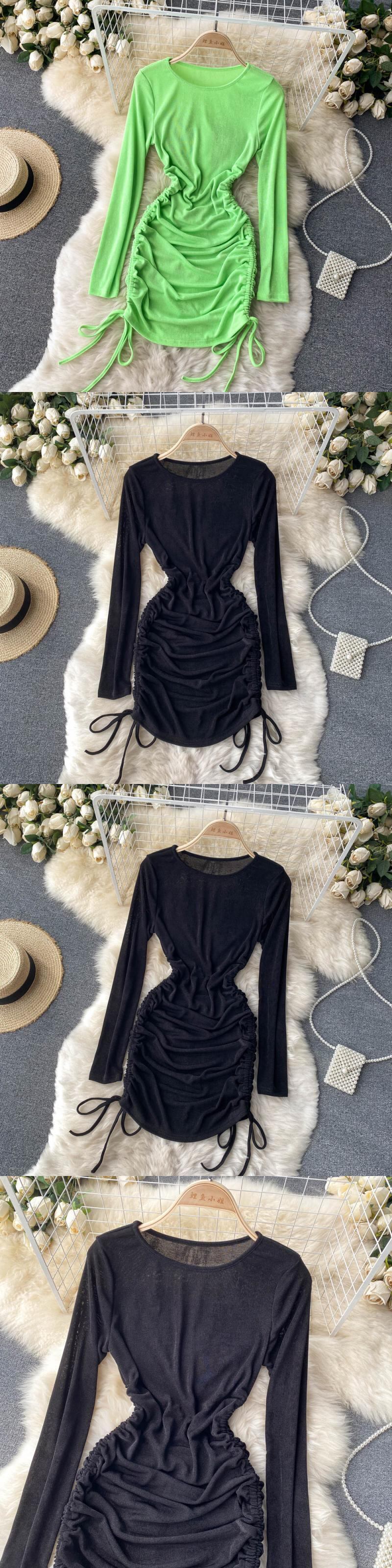 Hong Kong style chic solid color simple long-sleeved dress female waist pleated tie version age-reducing bottoming bag hip skirt ロング プリーツ スカート ソリッドカラー lyxaj81737540177