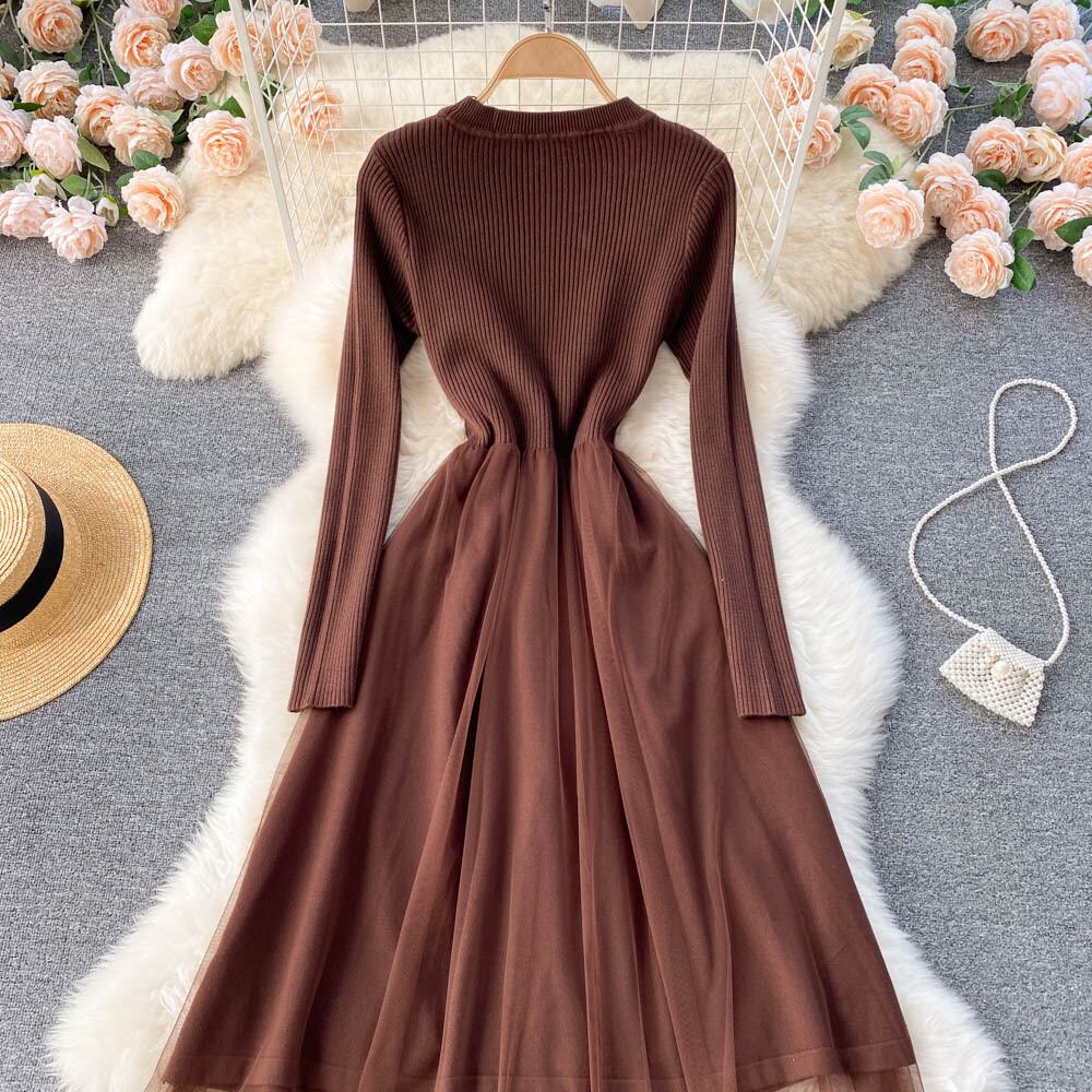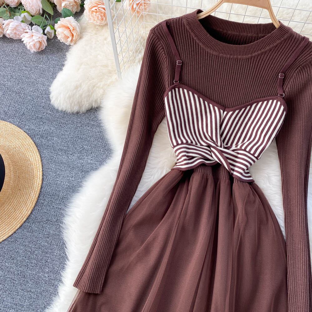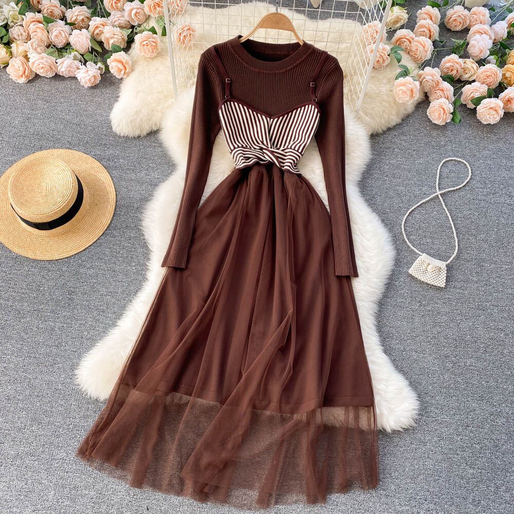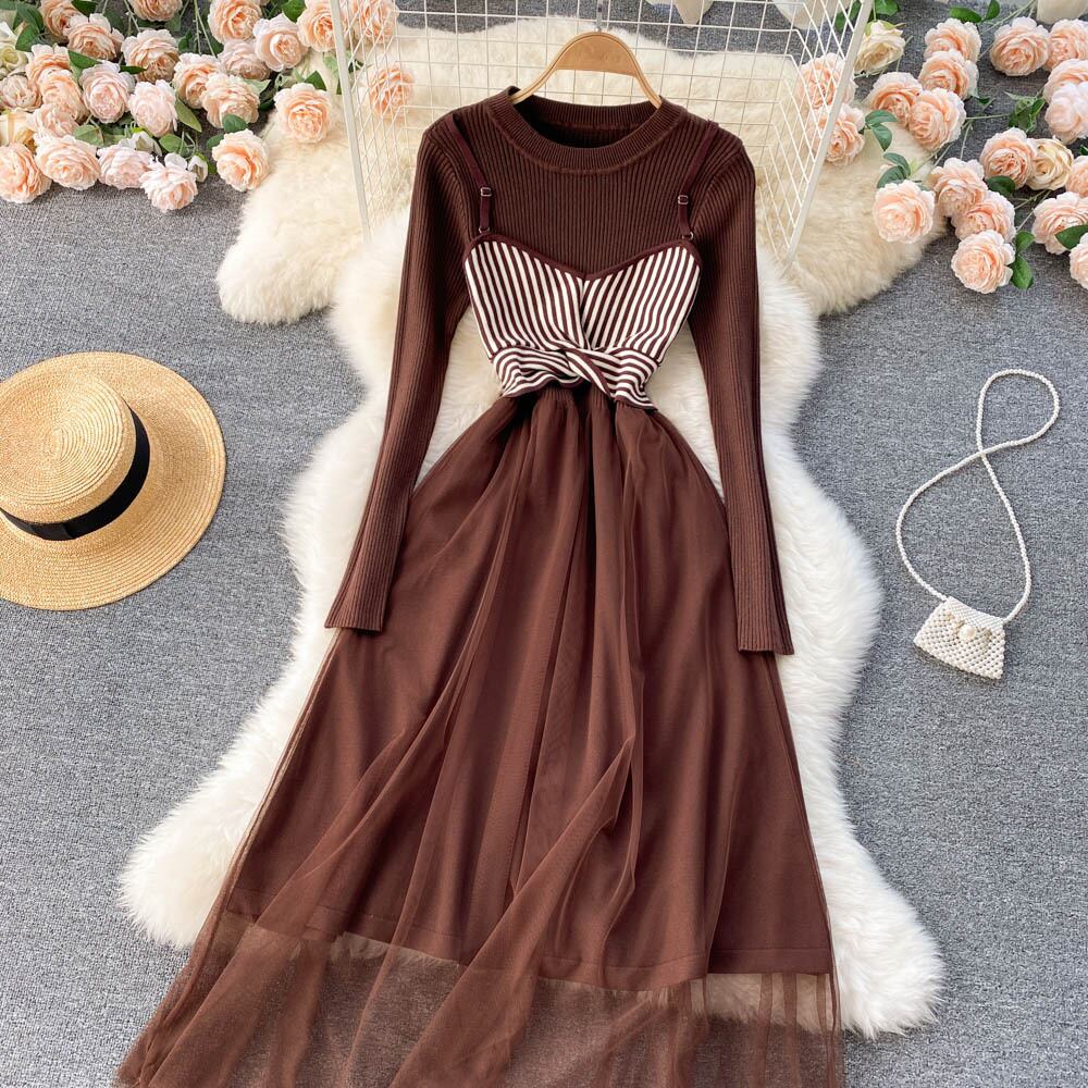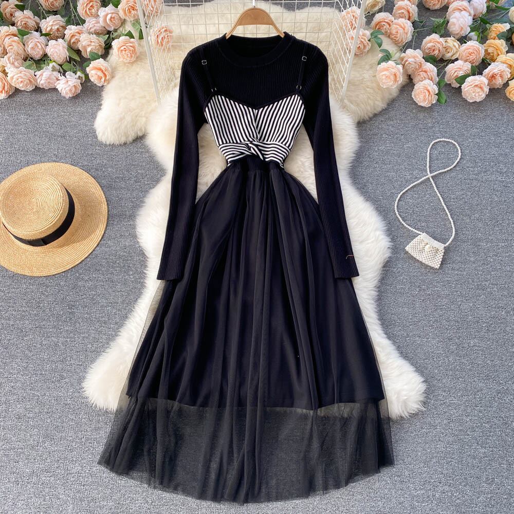 French retro gentle wind fake two-piece dress women waist slim mesh stitching knitted long-sleeved knee-length dress ロング レトロ メッシュ スリム ステッチ lyxaj73105005195