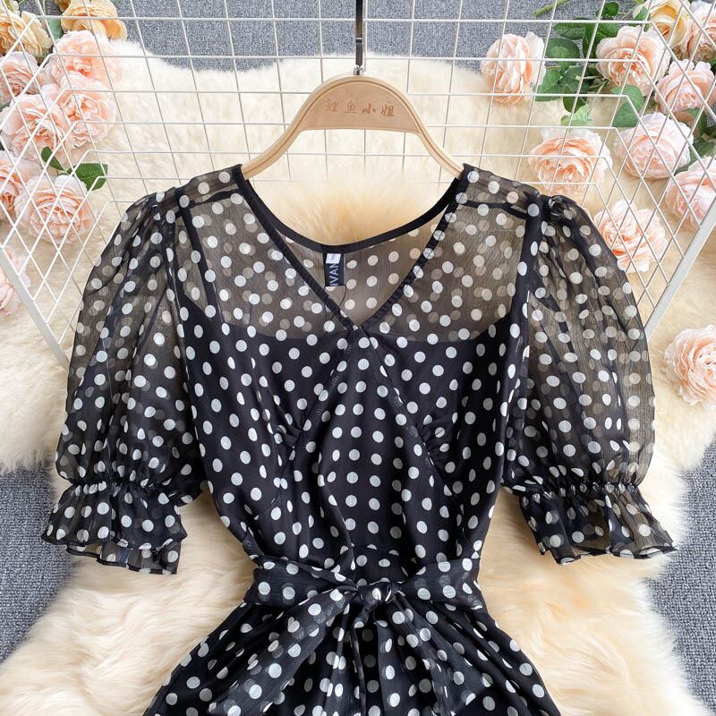 French dress 2021 new summer dress goddess fan temperament V-neck slim mid-length ruffled polka dot dress skirt サマー 夏物 スカート Vネック スリム lyxaj59730476382