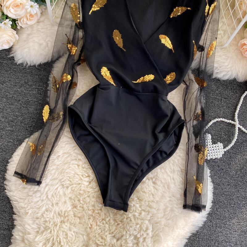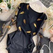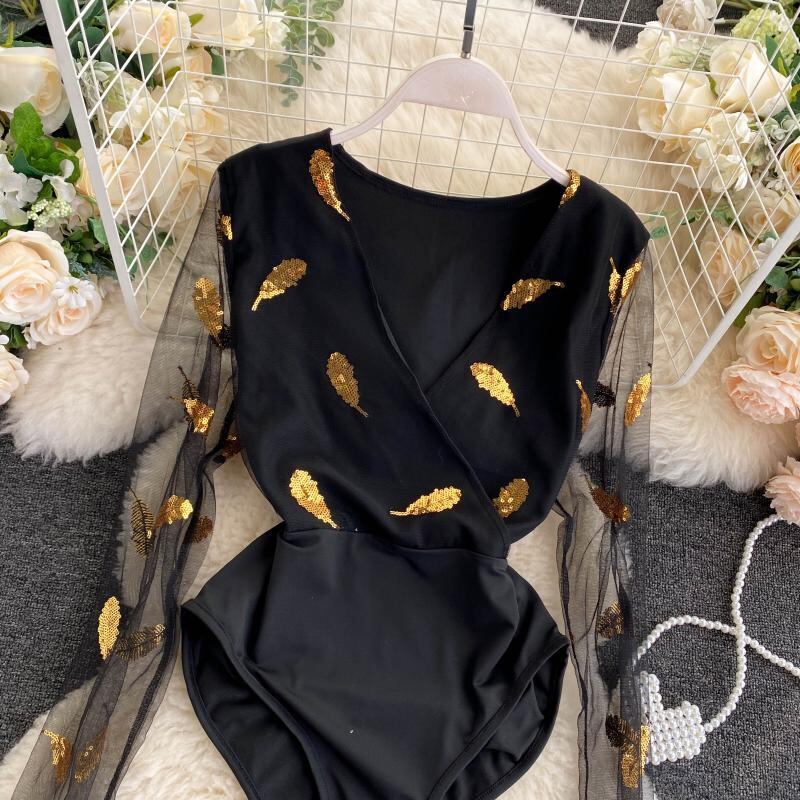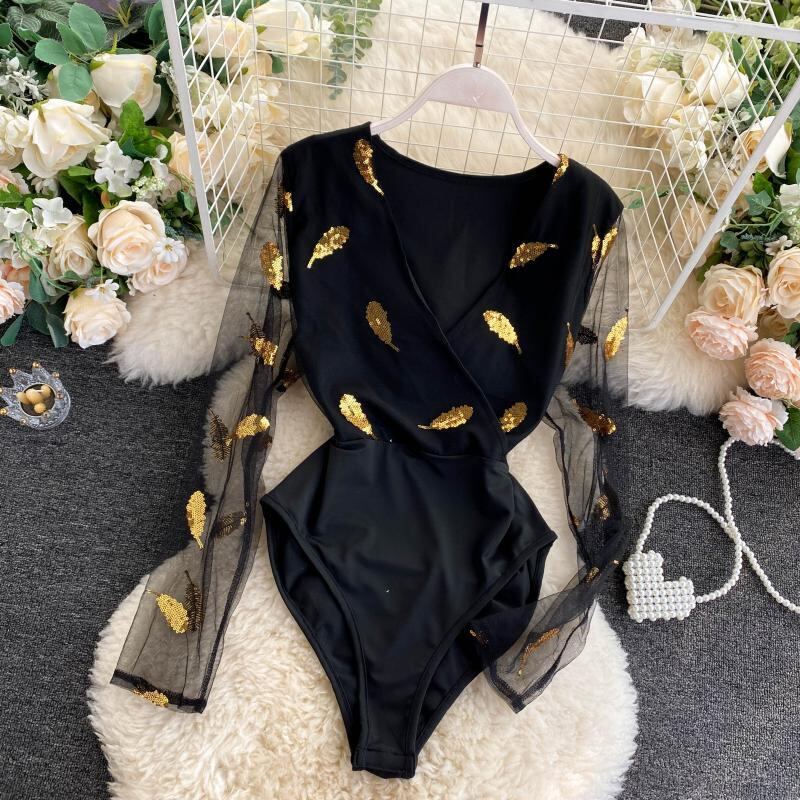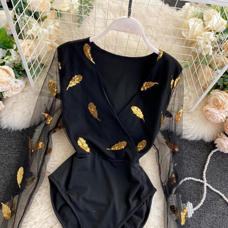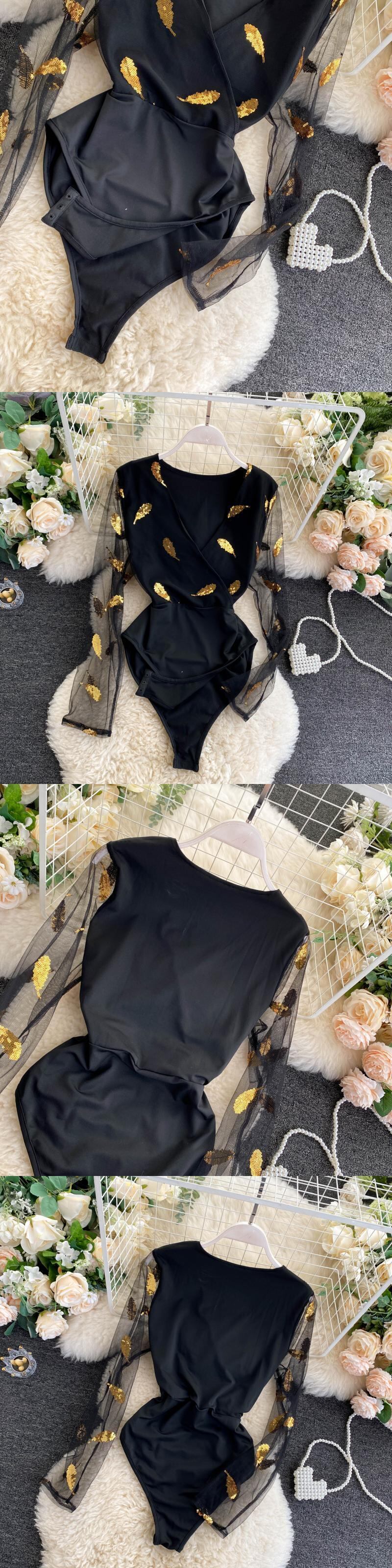version of the new anti-glare jumpsuit women's sexy V-neck long-sleeved gold leaf mesh autumn one-piece top women ロング オータム 秋物 メッシュ Vネック lyxaj66151678186