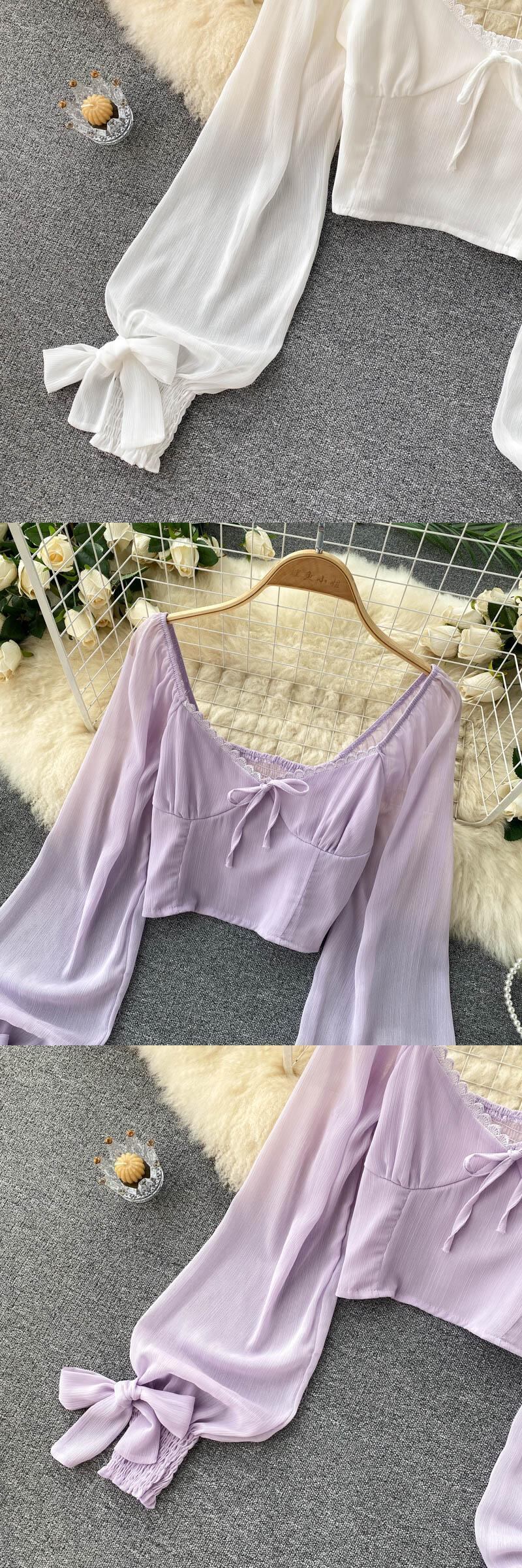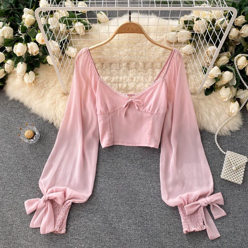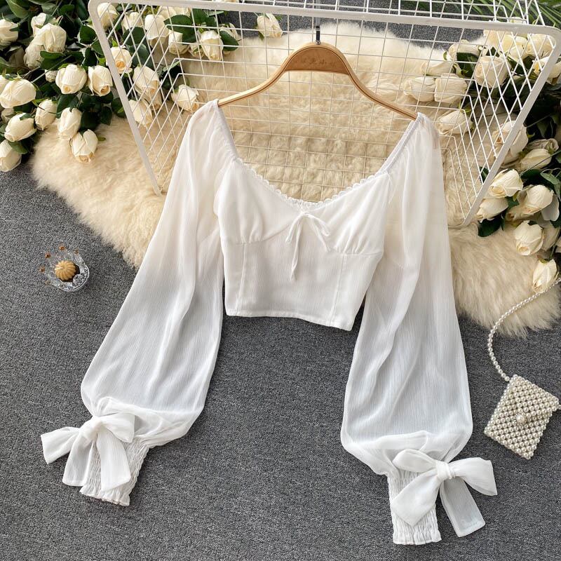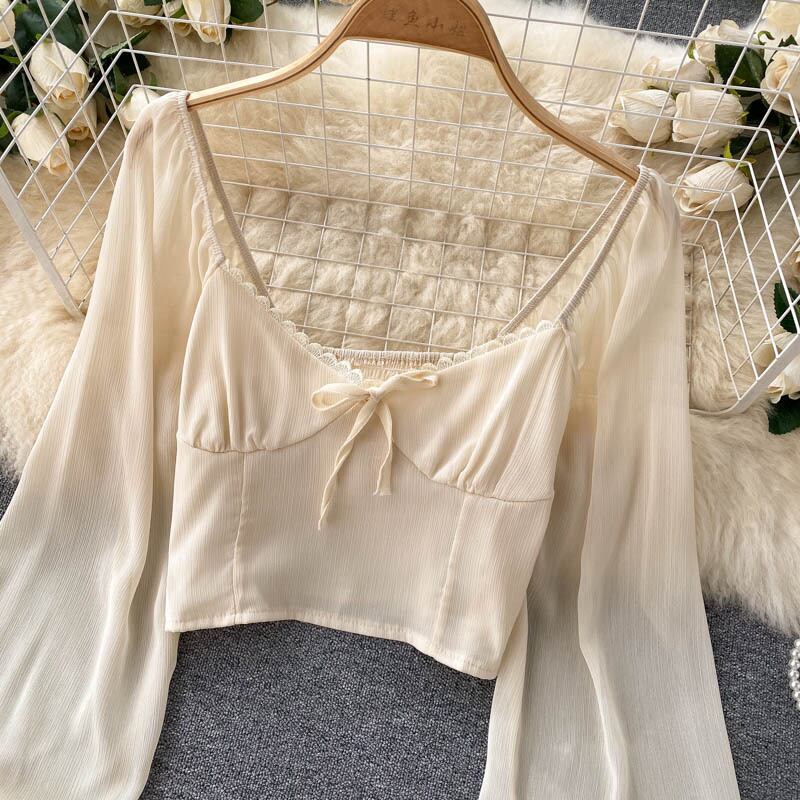ins holiday style chiffon top women's summer new age-reducing puff sleeves slim short style all-match navel small shirt tide ショート シフォン サマー 夏物 スリム lyxaj12270423429