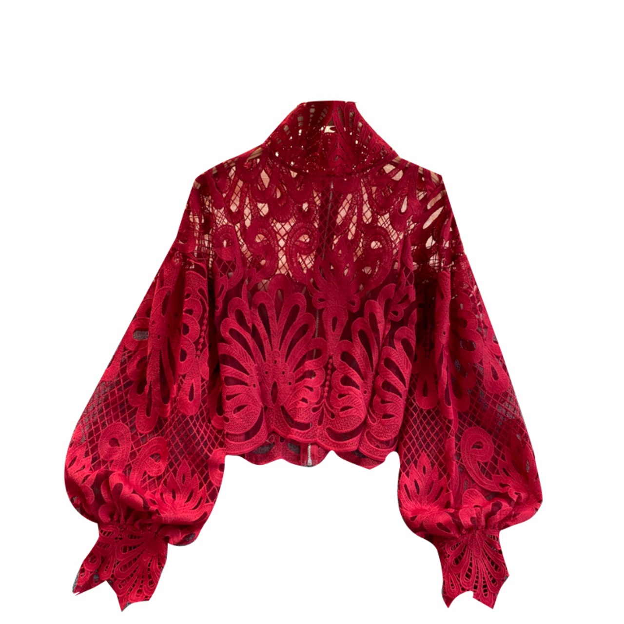Palace style shirt women's design sense niche hollow lantern sleeves temperament stand-up collar slim short top women's lace shirt ショート ランタンスリーブ レース スリム lyxaj51331013238