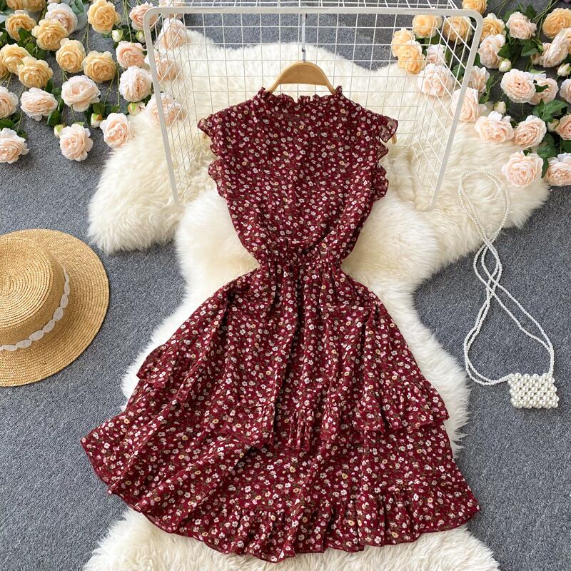 2022 summer round neck tie bow sleeveless mid-length waist slim ruffled floral chiffon dress シフォン リボン サマー 夏物 ノースリーブ 花柄 Oネック スリム lyxaj14986374087