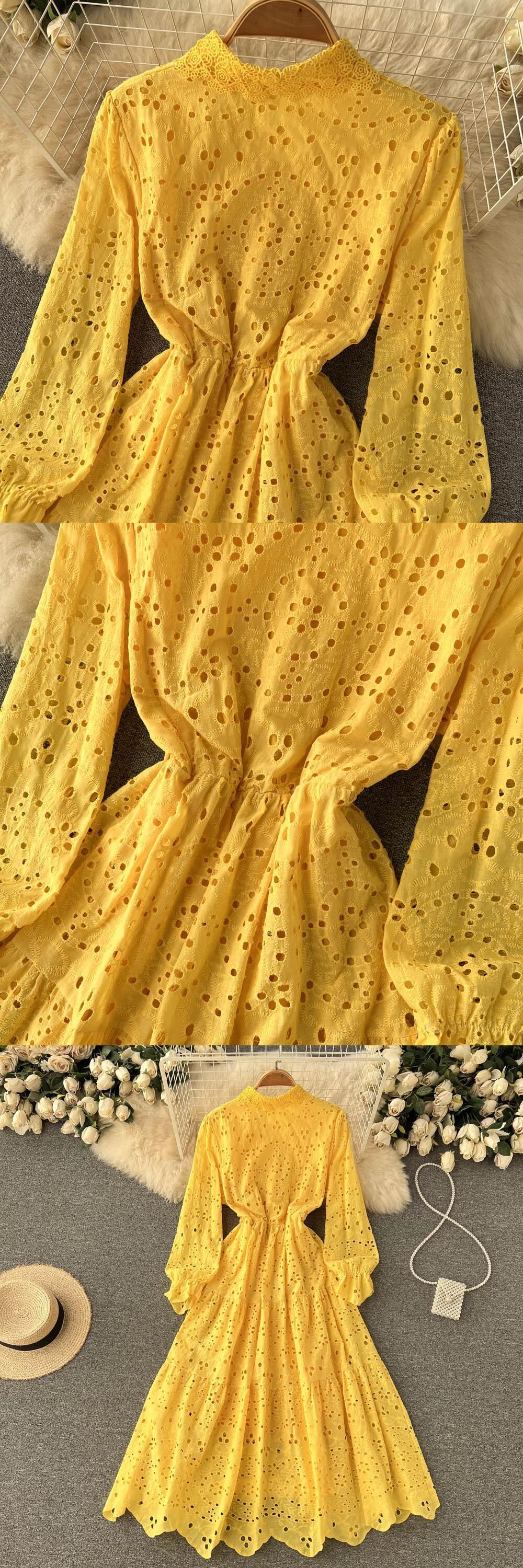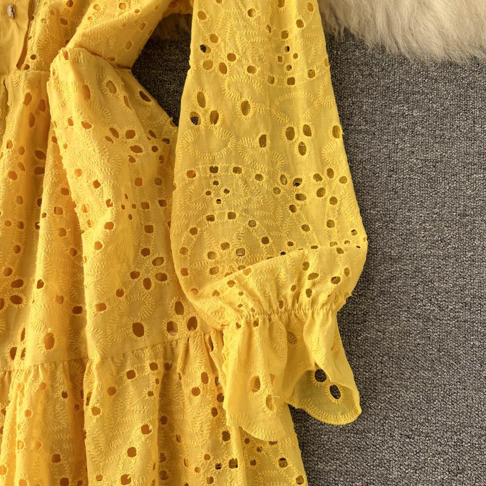 French Retro Hollow Embroidery Dress Lace Stitching Lapel Puff Sleeves Waist Temperament Swing Over Knee Long Skirt ロング レトロ レース 刺繍 スカート ステッチ lyxaj79313742289