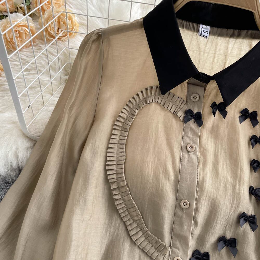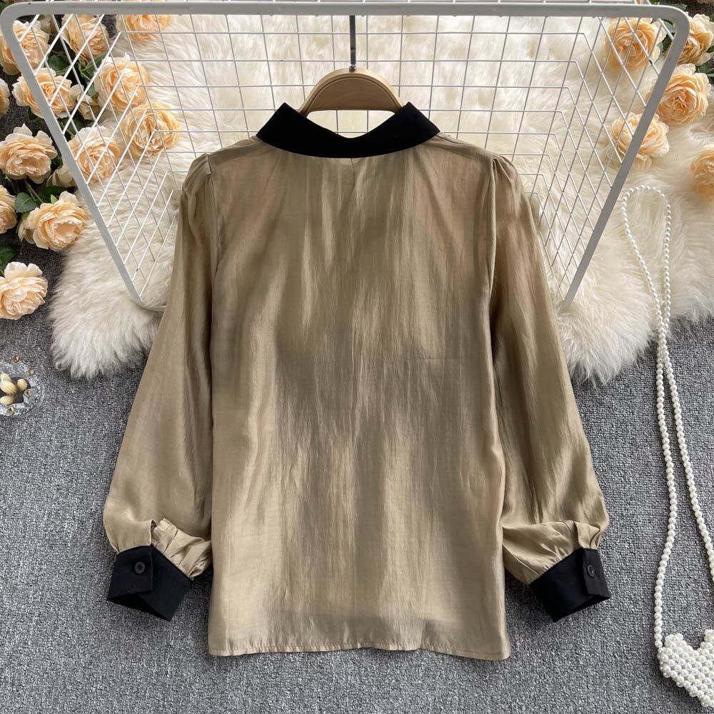 Contrast color bow shirt women's 2022 spring new design niche single-breasted fashion long-sleeved satin top ロング リボン スプリング 春物 サテン lyxaj51589446672