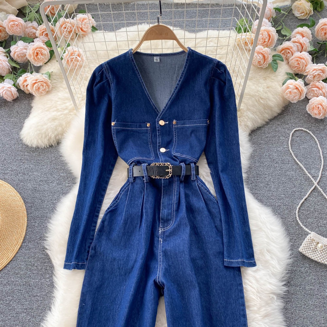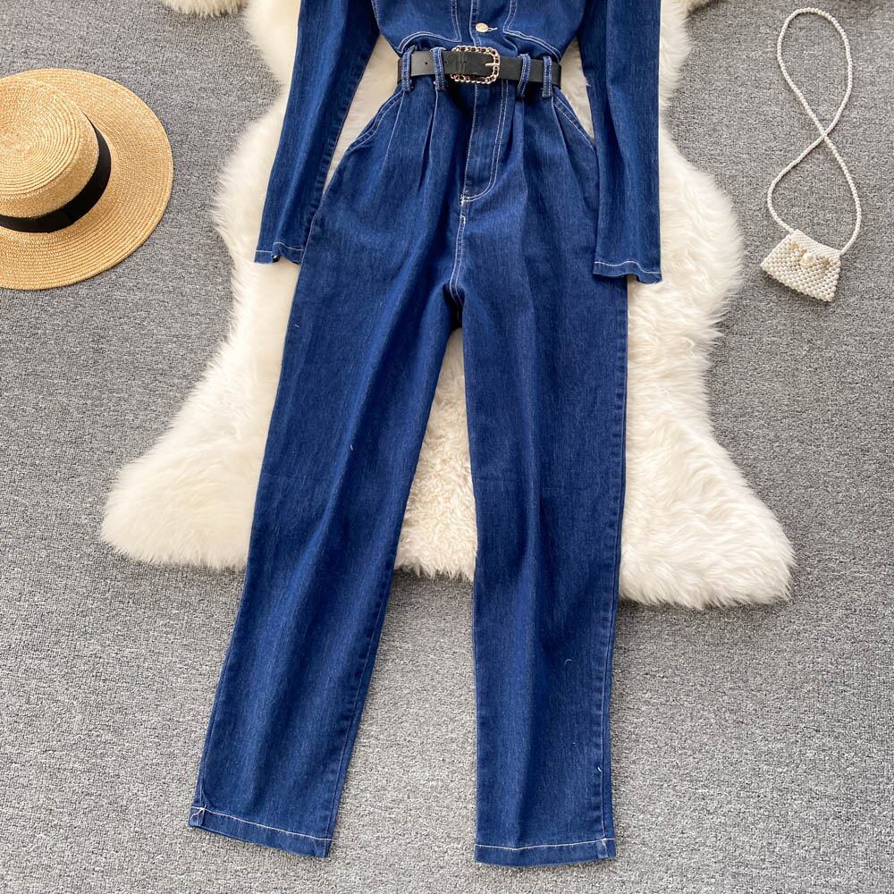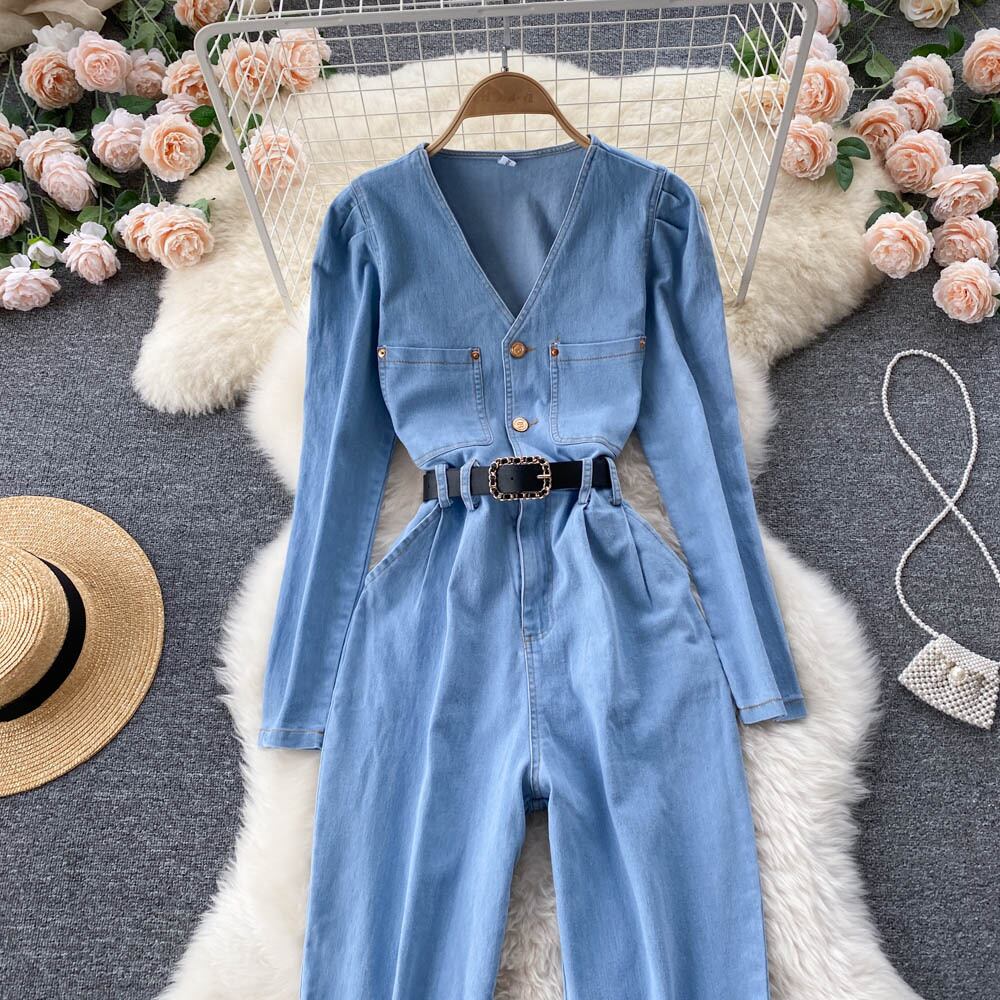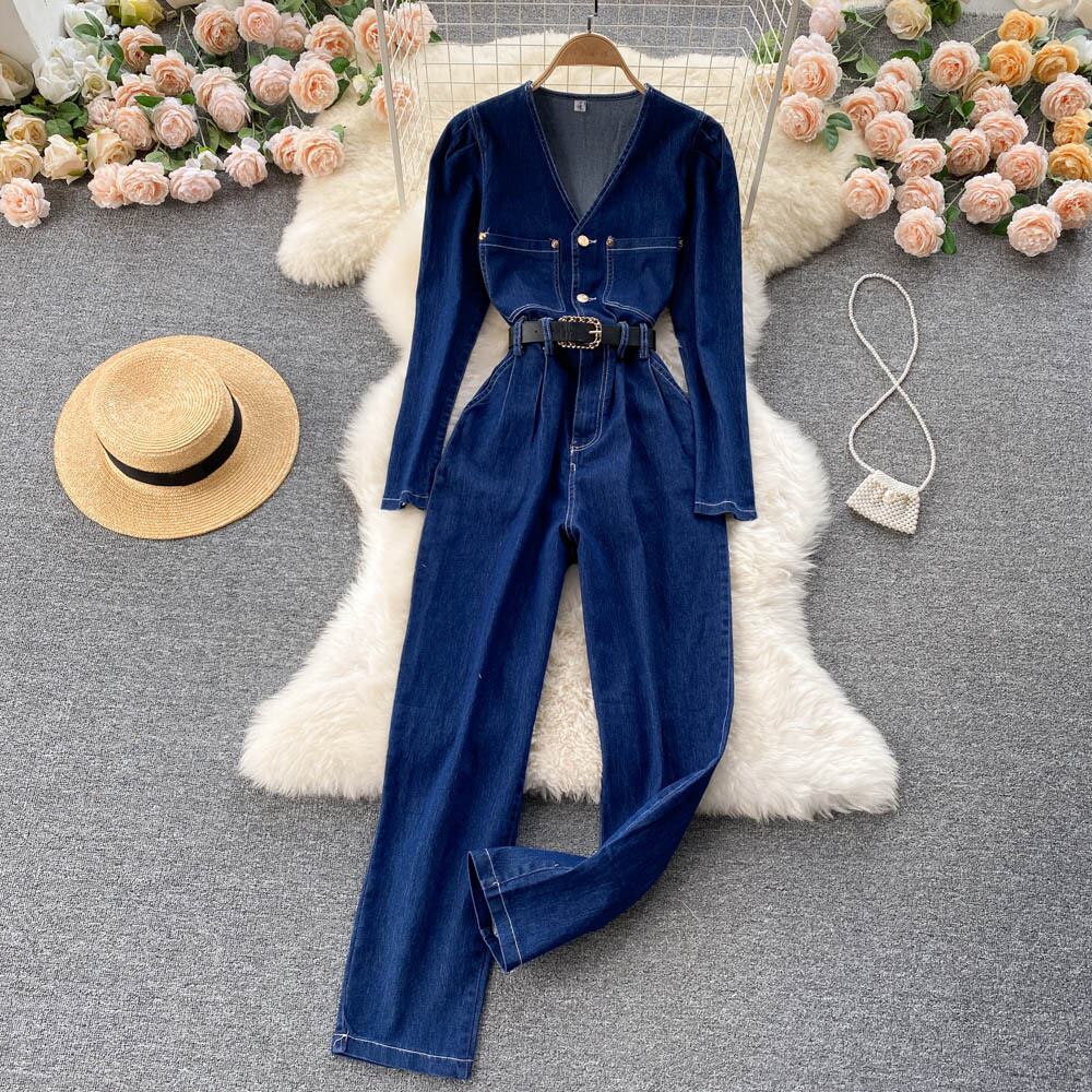 Hong Kong style retro waisted temperament denim jumpsuit women's French V-neck long-sleeved overalls 2021 new trend ロング レトロ Vネック lyxaj20782455140