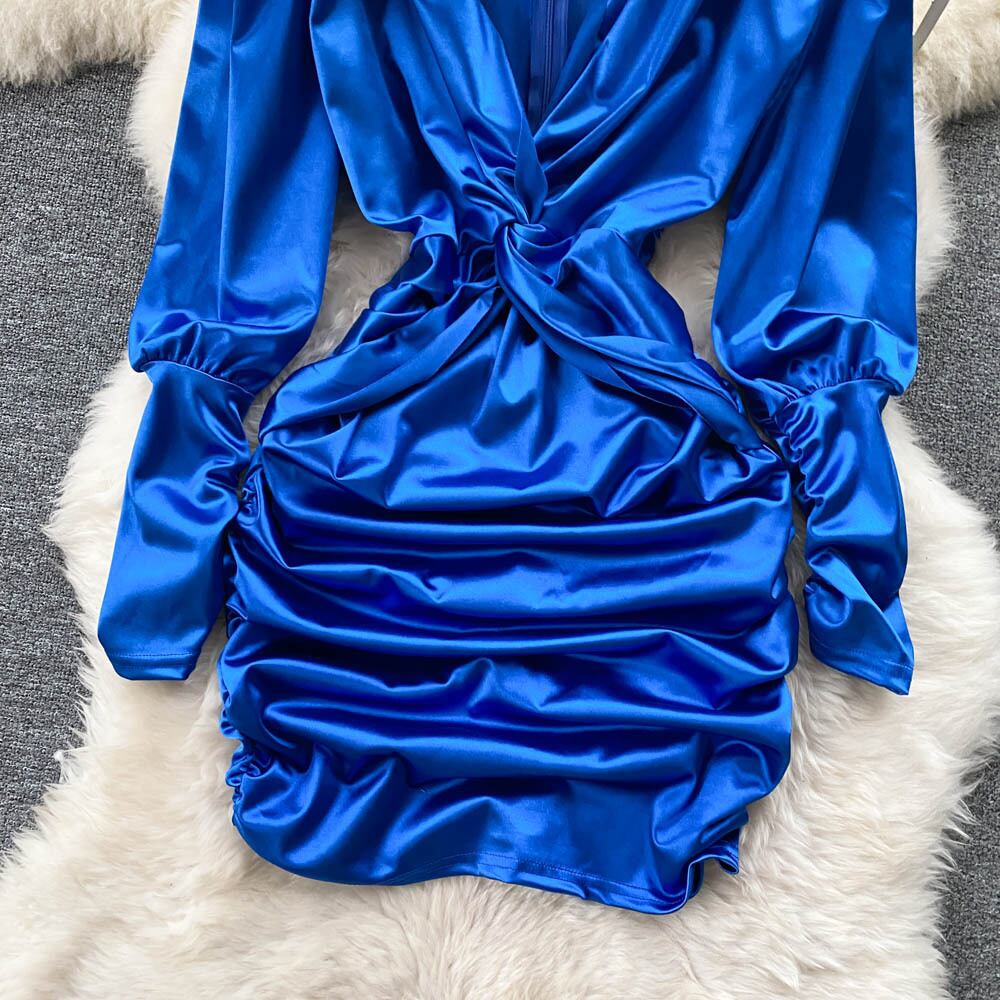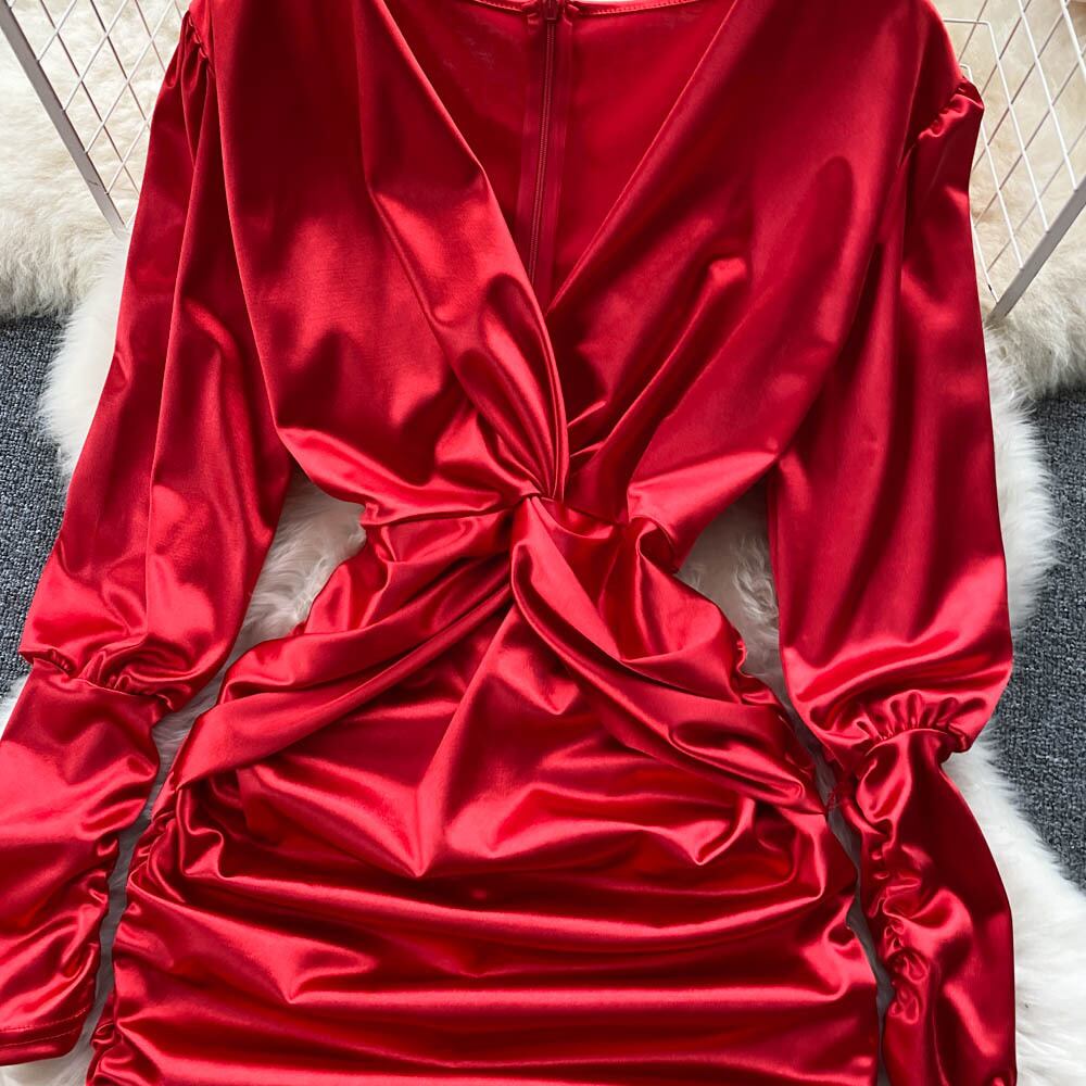 Celebrity temperament V-neck low-cut satin pleated high-end dress goddess fan self-cultivation bag hip sexy short skirt ショート プリーツ スカート Vネック サテン lyxaj16037021640