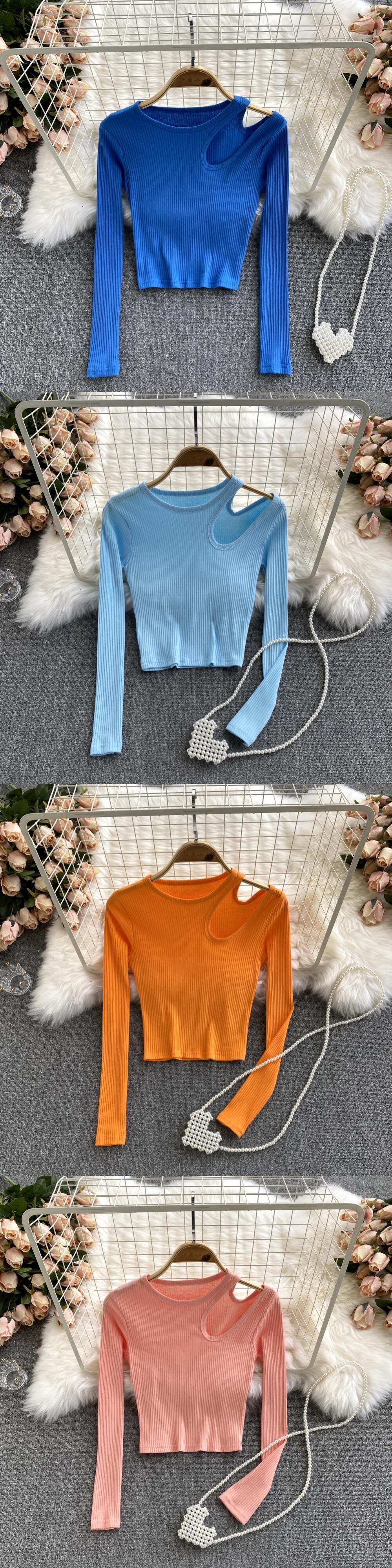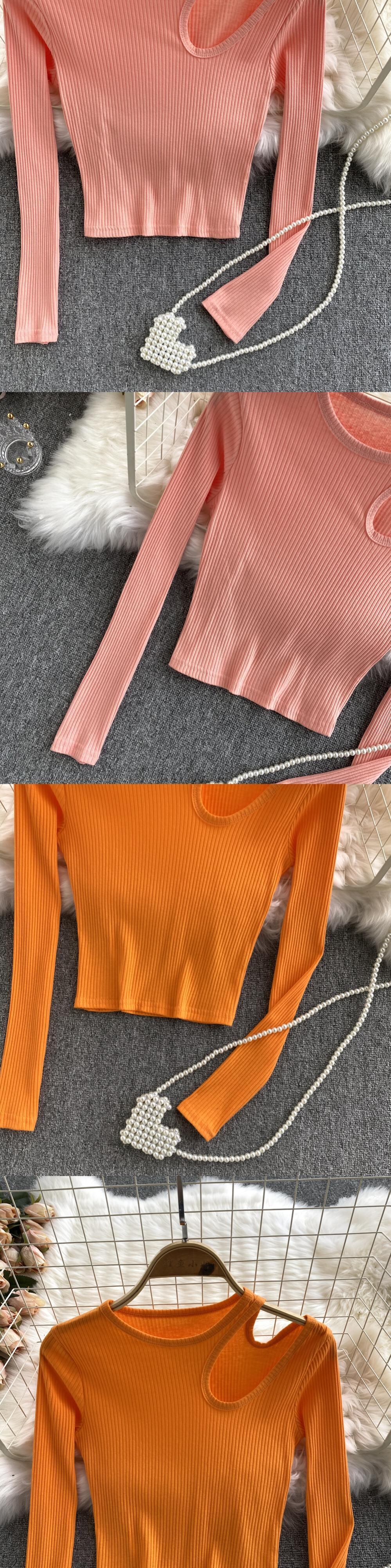 European and American ins design sense niche solid color hollow out shoulders long-sleeved slim fit short t-shirt bottoming shirt top women ショート ロング スリム Tシャツ ソリッドカラー ヨーロピアン lyxaj33408096939