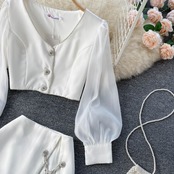 Puff-sleeved short V-neck shirt small fresh, sweet and simple split A-line high-waisted skirt women's two-piece suit ショート 大人ガーリー スウィート キュート カジュアル スカート Vネック Aライン lyxaj88062996682