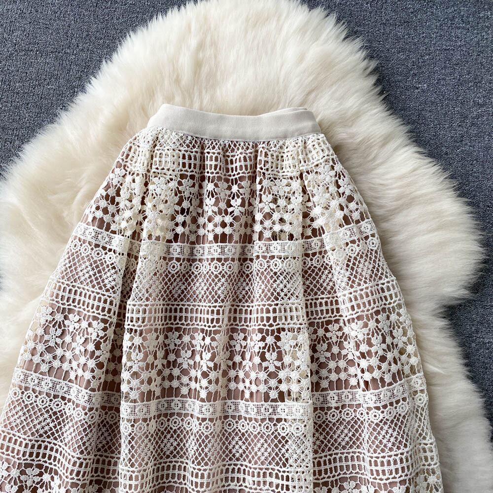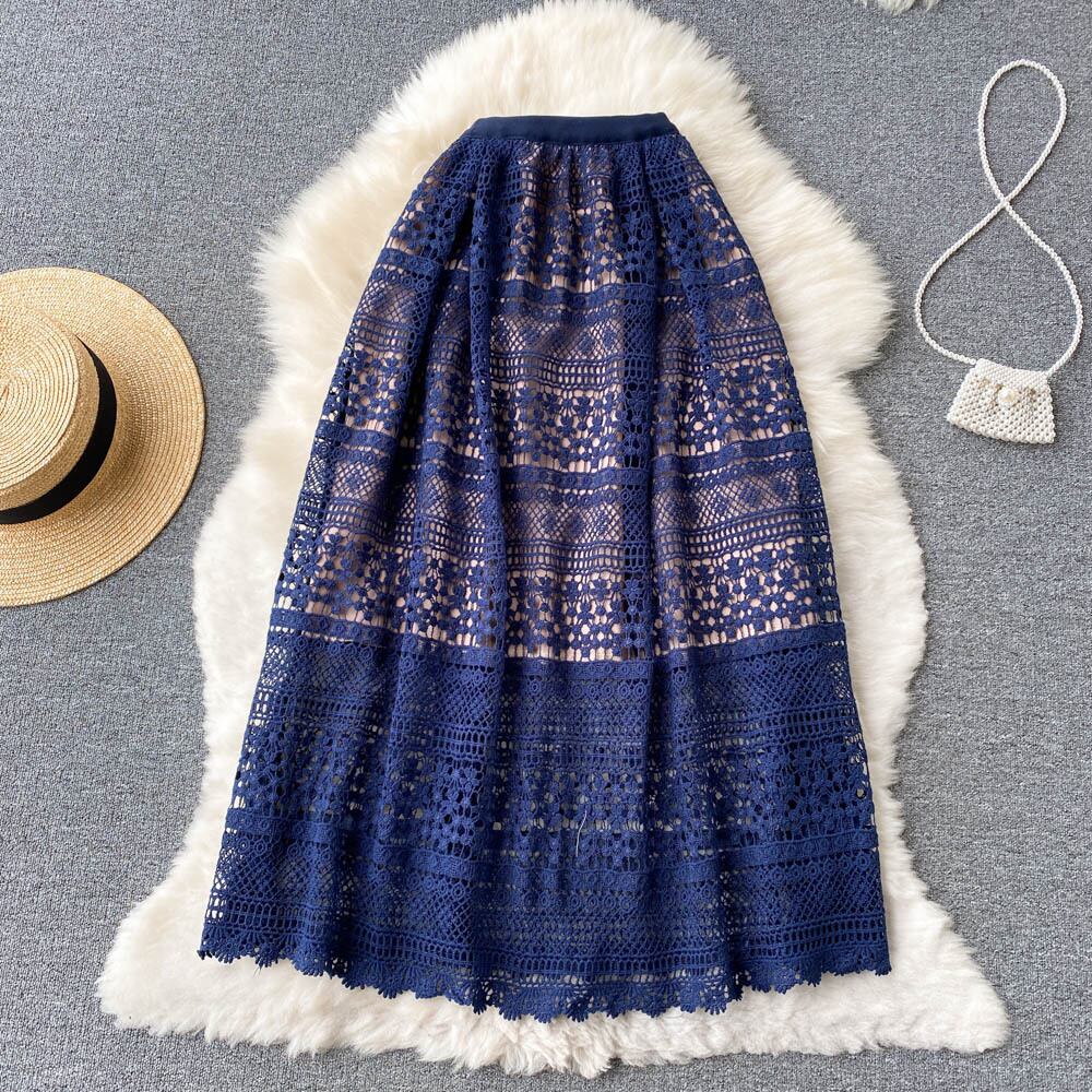2022 spring new retro style high waist and thin mid-length crocheted hollow lace large swing skirt women ハイウェスト レトロ レース スプリング 春物 スカート lyxaj65977913129