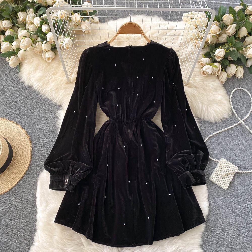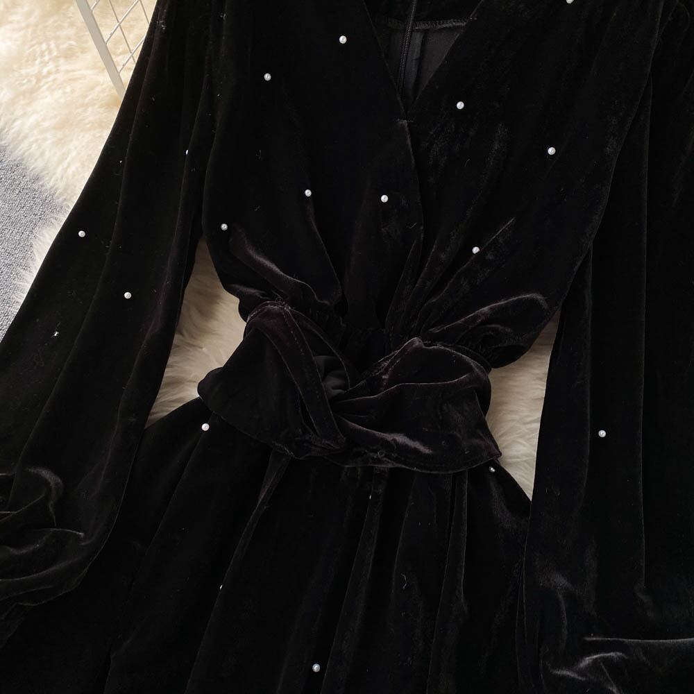 -end light luxury ladies dress French V-neck retro velvet dress waist is thin and light and mature temperament little black dress ブラック レトロ Vネック lyxaj26994624335