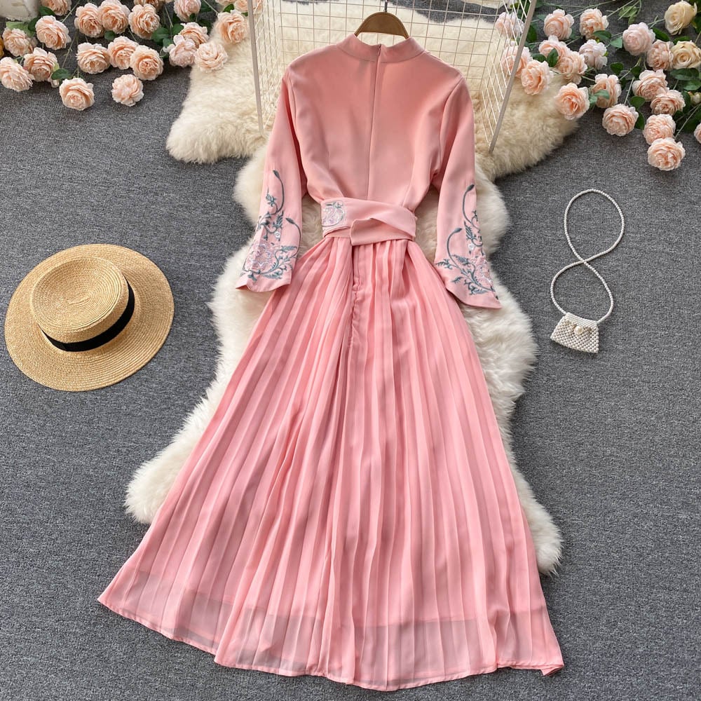 Temperament design sense lace waist is thin over the knee pleated skirt French retro long skirt V-neck dress ロング レトロ レース プリーツ スカート Vネック lyxaj57810531217