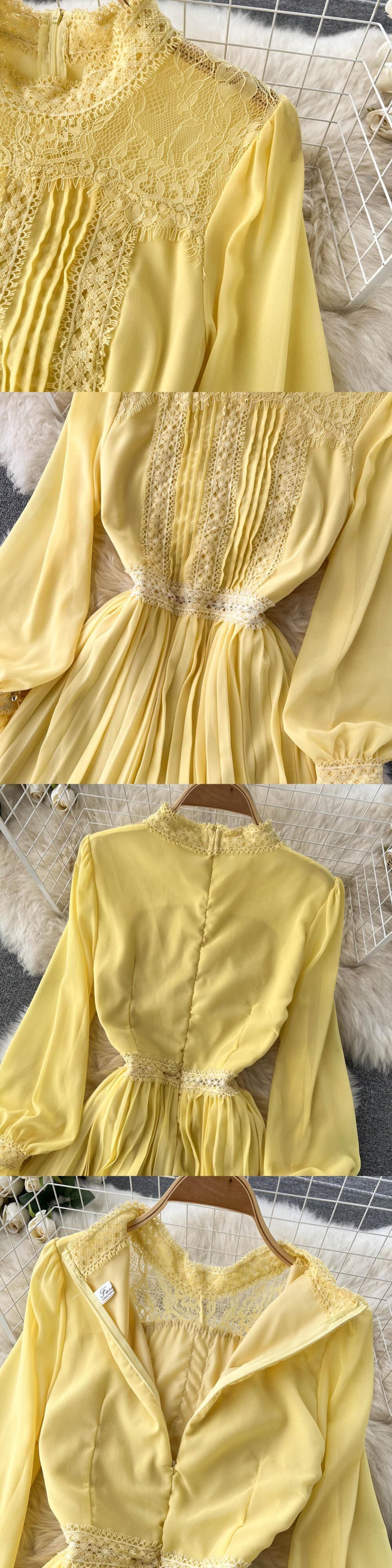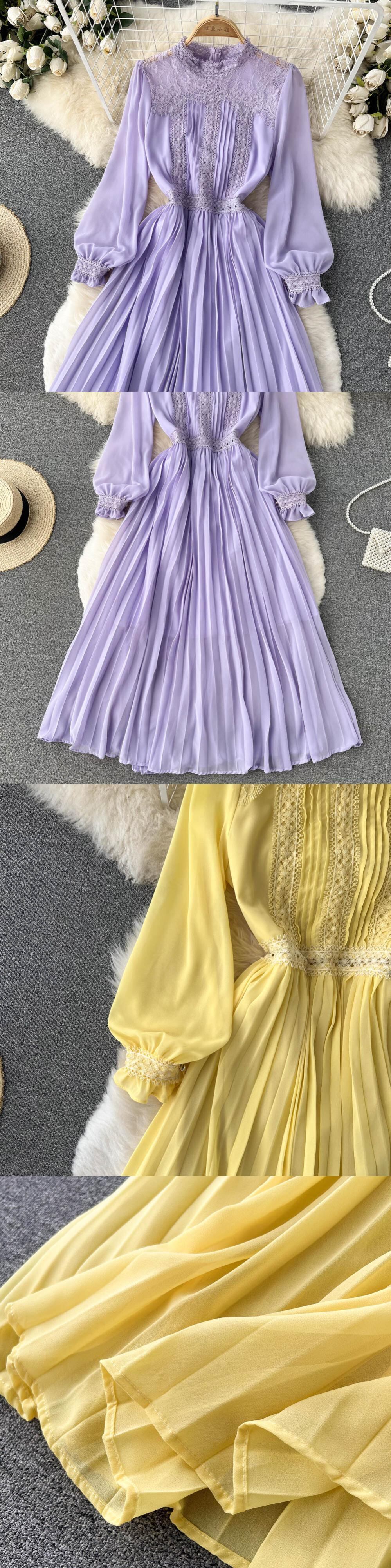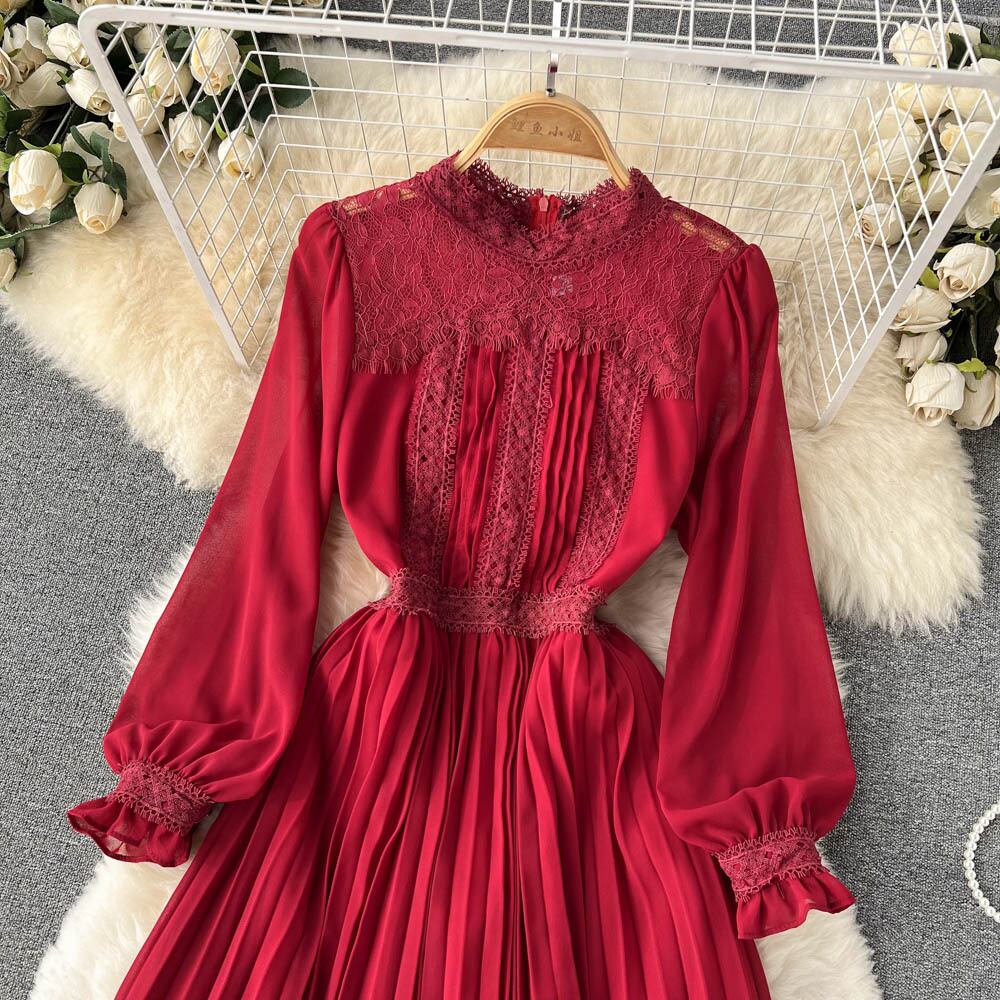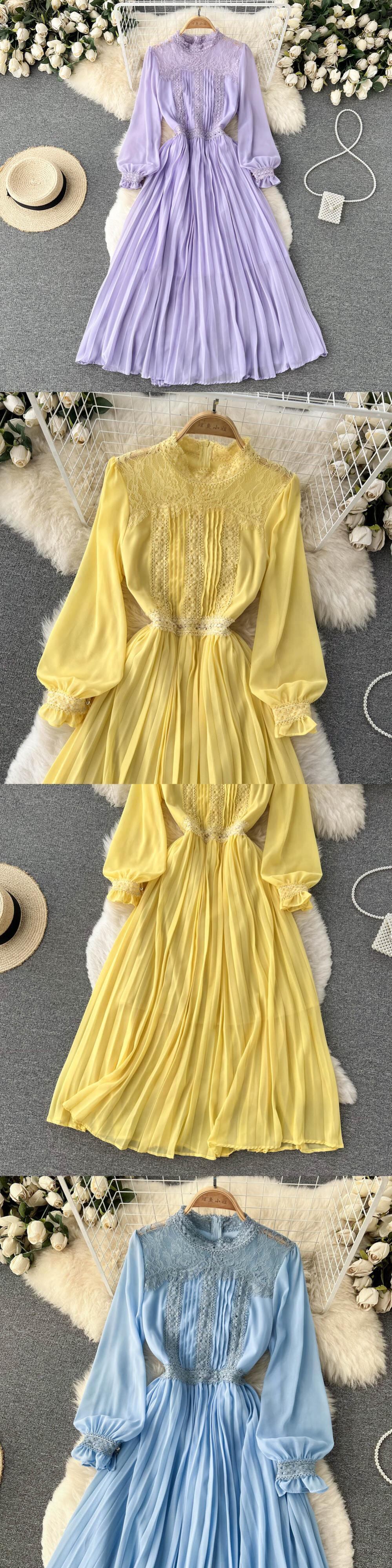 Goddess Fan temperament waist and thin knee-length skirt pleated skirt French retro big swing long skirt round neck dress ロング レトロ プリーツ スカート Oネック lyxaj57388193332