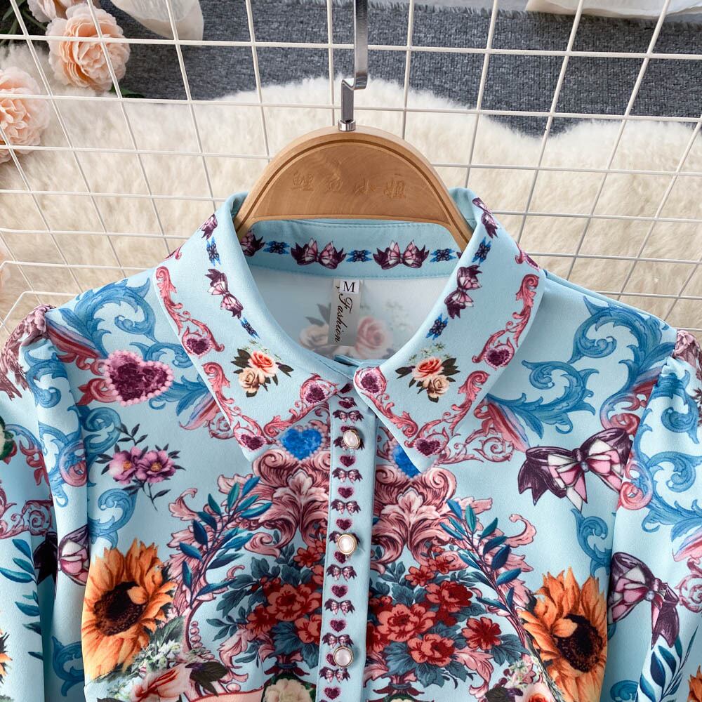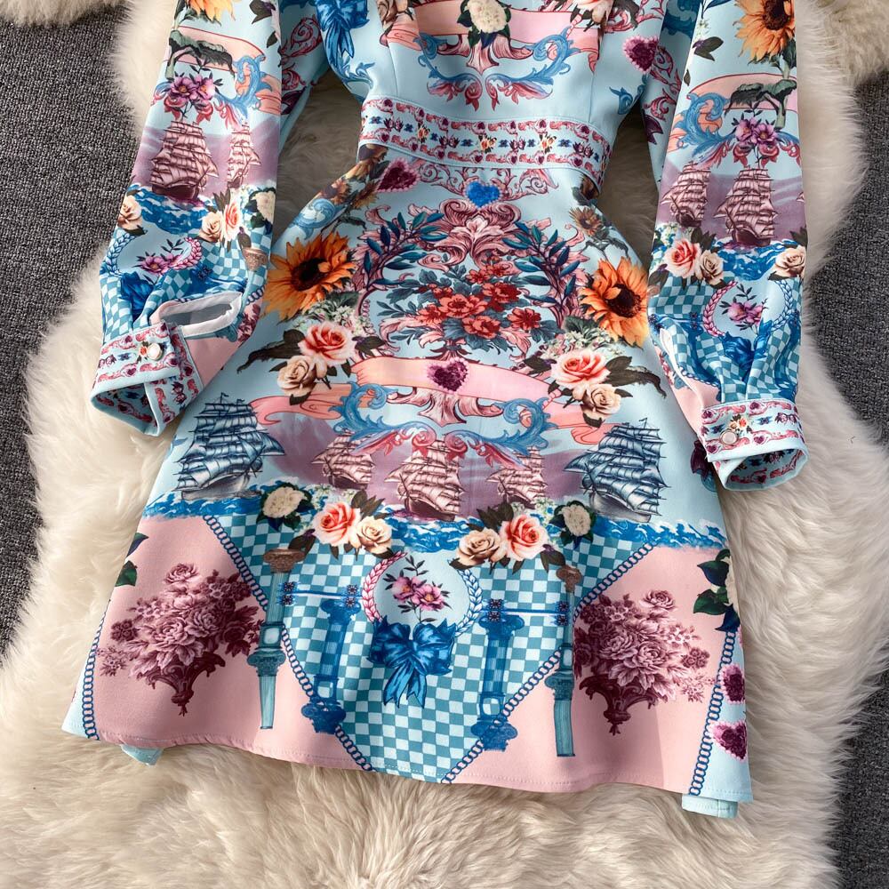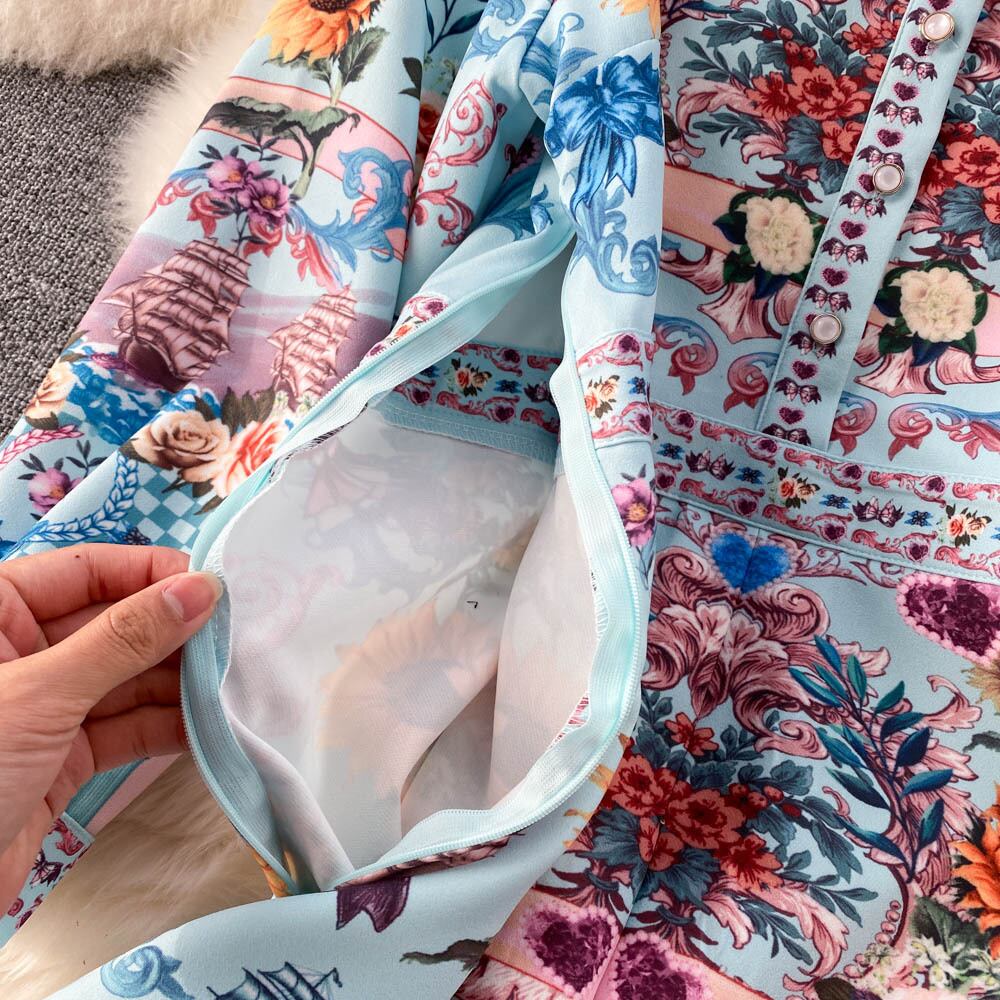 Palace style retro print high-quality dress slim fit and slim temperament polo collar long-sleeved A-line skirt small man ロング レトロ レース スカート Aライン スリム lyxaj12772334662