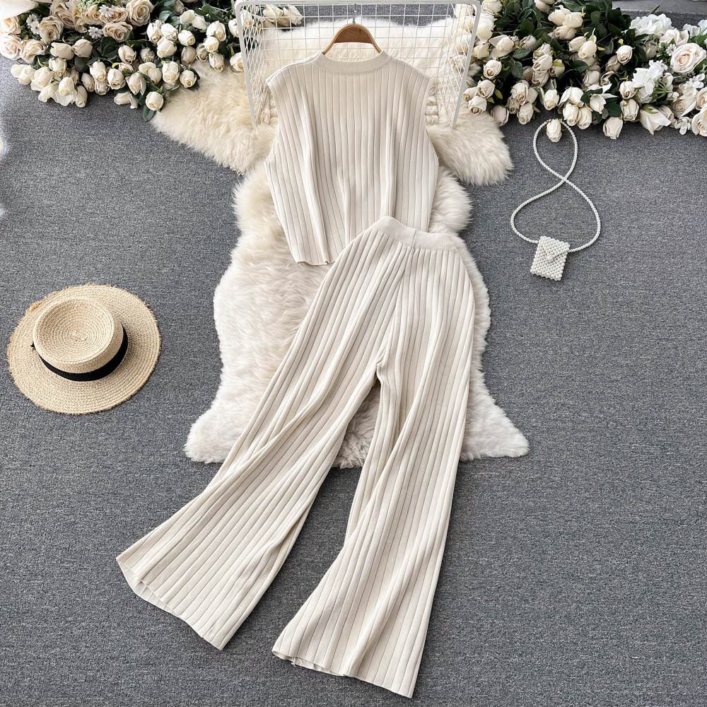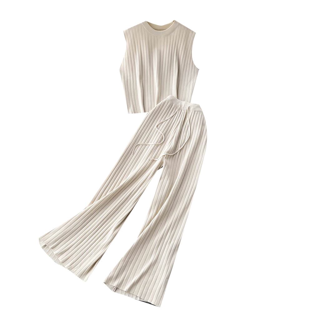 casual knitted suit women's summer short loose sleeveless top high waist drape wide leg pants two-piece trendy ハイウェスト ショート カジュアル サマー 夏物 ノースリーブ ワイドレッグ ワイドパンツ lyxaj82806168735