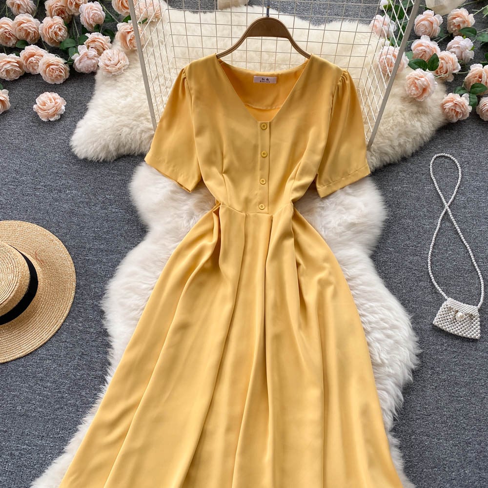 Summer fashion version of the high-waisted thin ladylike temperament waist and thin mid-length short-sleeved V-neck solid color dress サマー 夏物 Vネック ソリッドカラー lyxaj90333880647