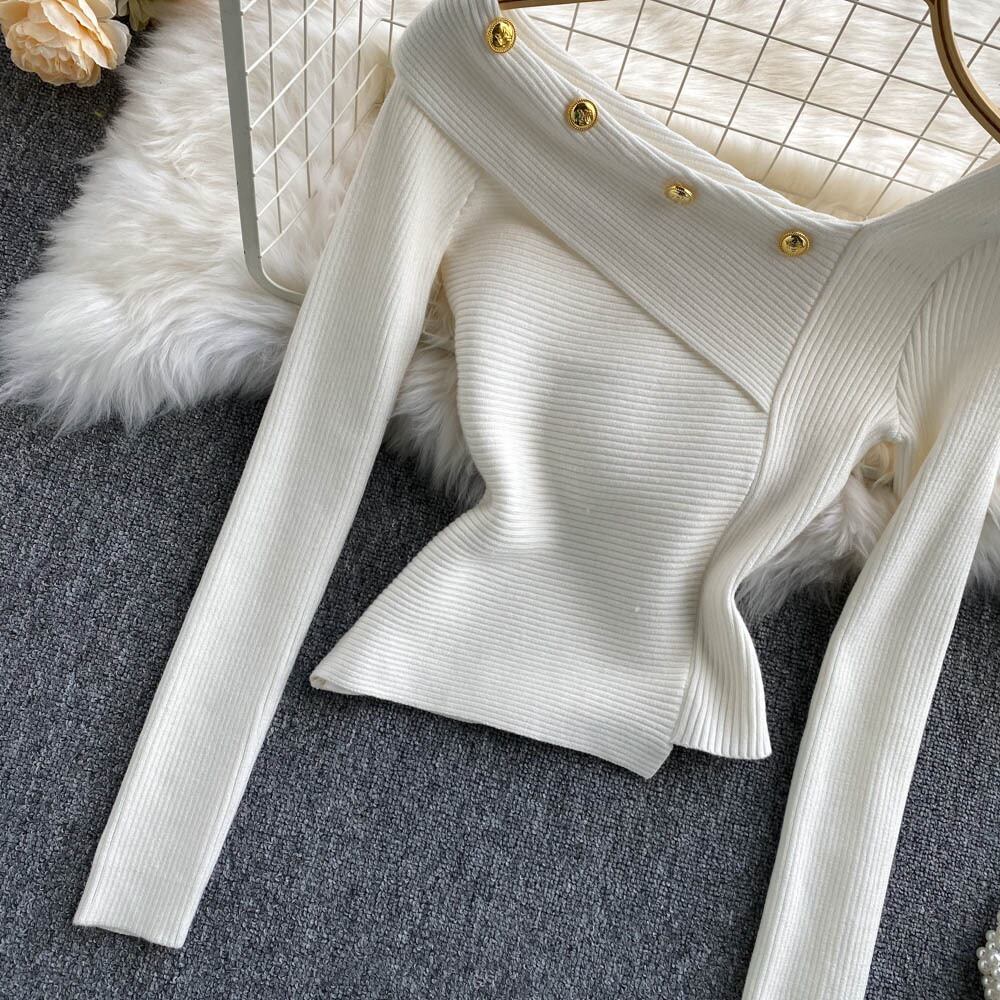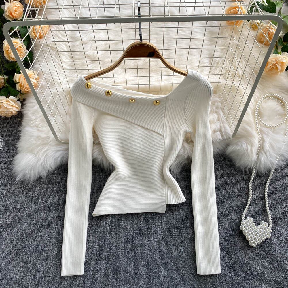 French chic collarbone top 2021 autumn and winter new knitted bottoming shirt irregular short sweater women ショート オータム 秋物 ウィンター 冬物 lyxaj3295906226
