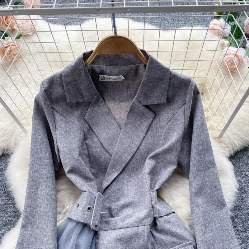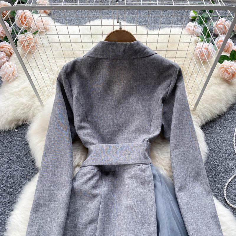 2022 spring new version of fashion ladies temperament suit collar long sleeves stitching irregular mesh dress women ロング 長袖 スプリング 春物 メッシュ ステッチ lyxaj7790344849