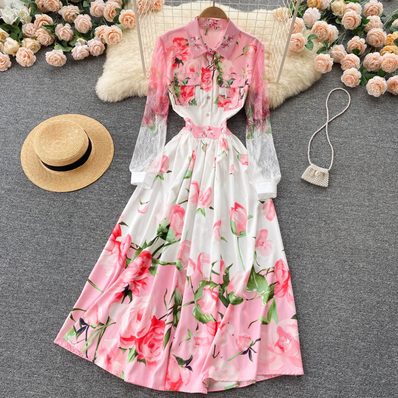 lady gentle wind retro long-sleeved shirt dress temperament printed lace long-sleeved stitching large swing dress ロング レトロ レース プリント ステッチ lyxaj60187334716