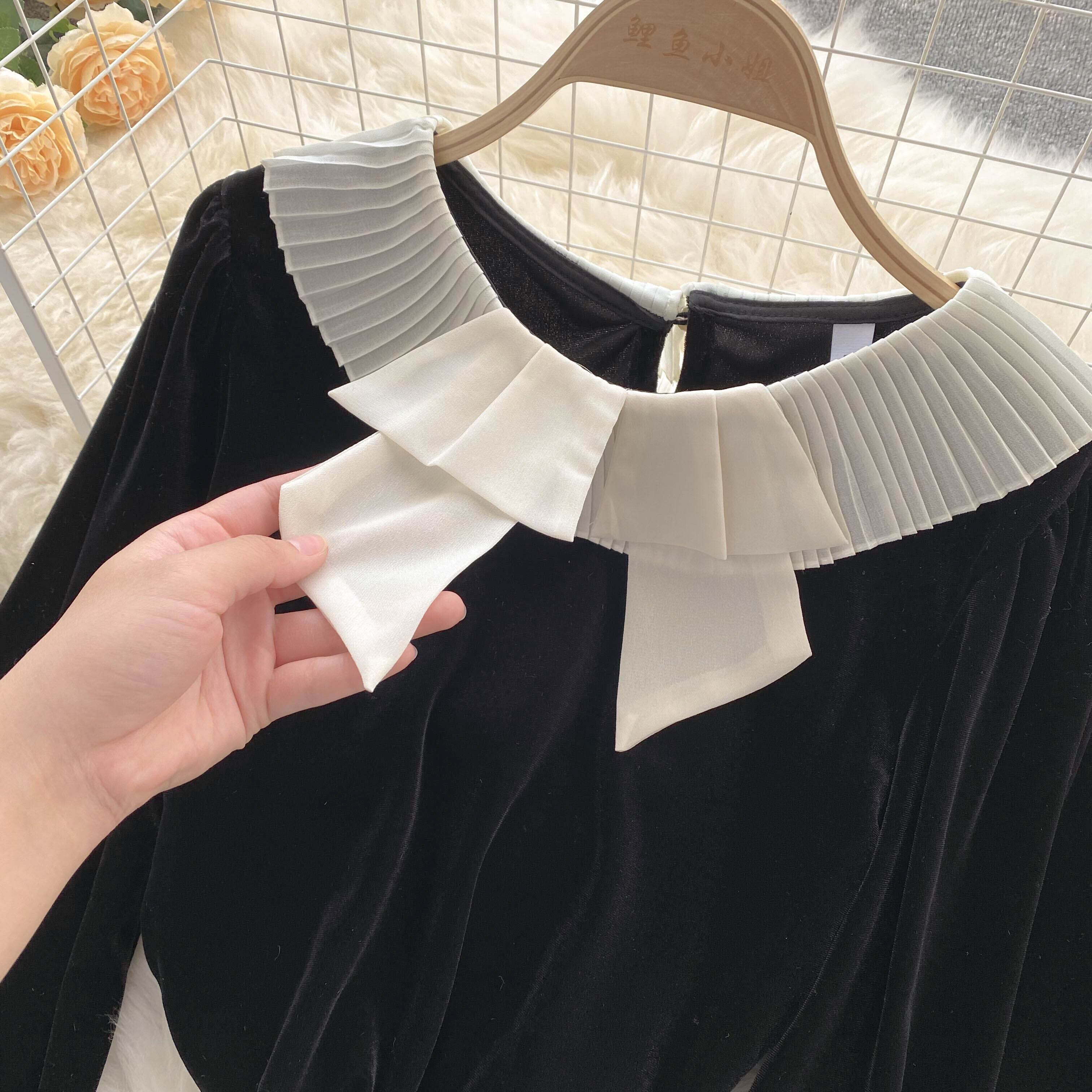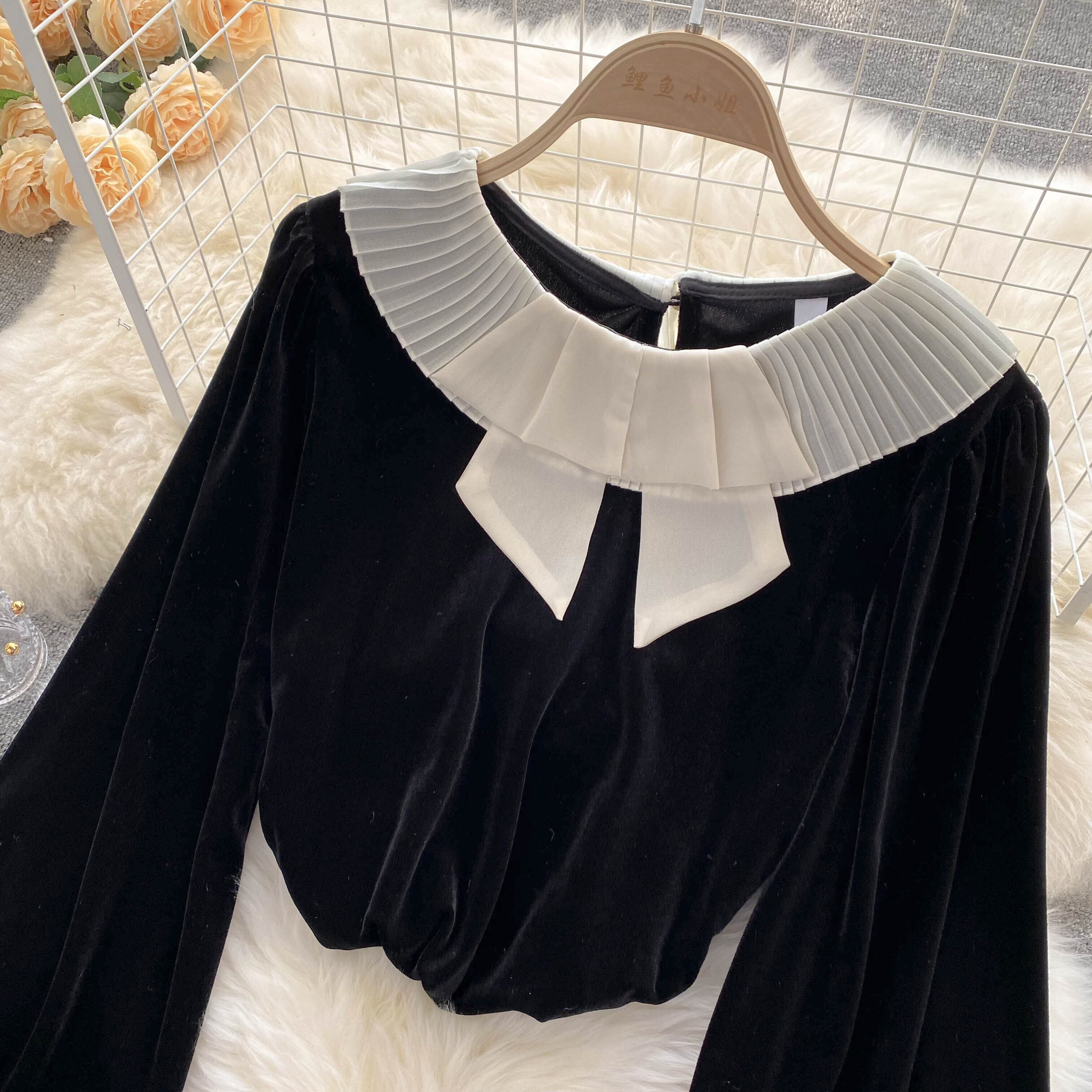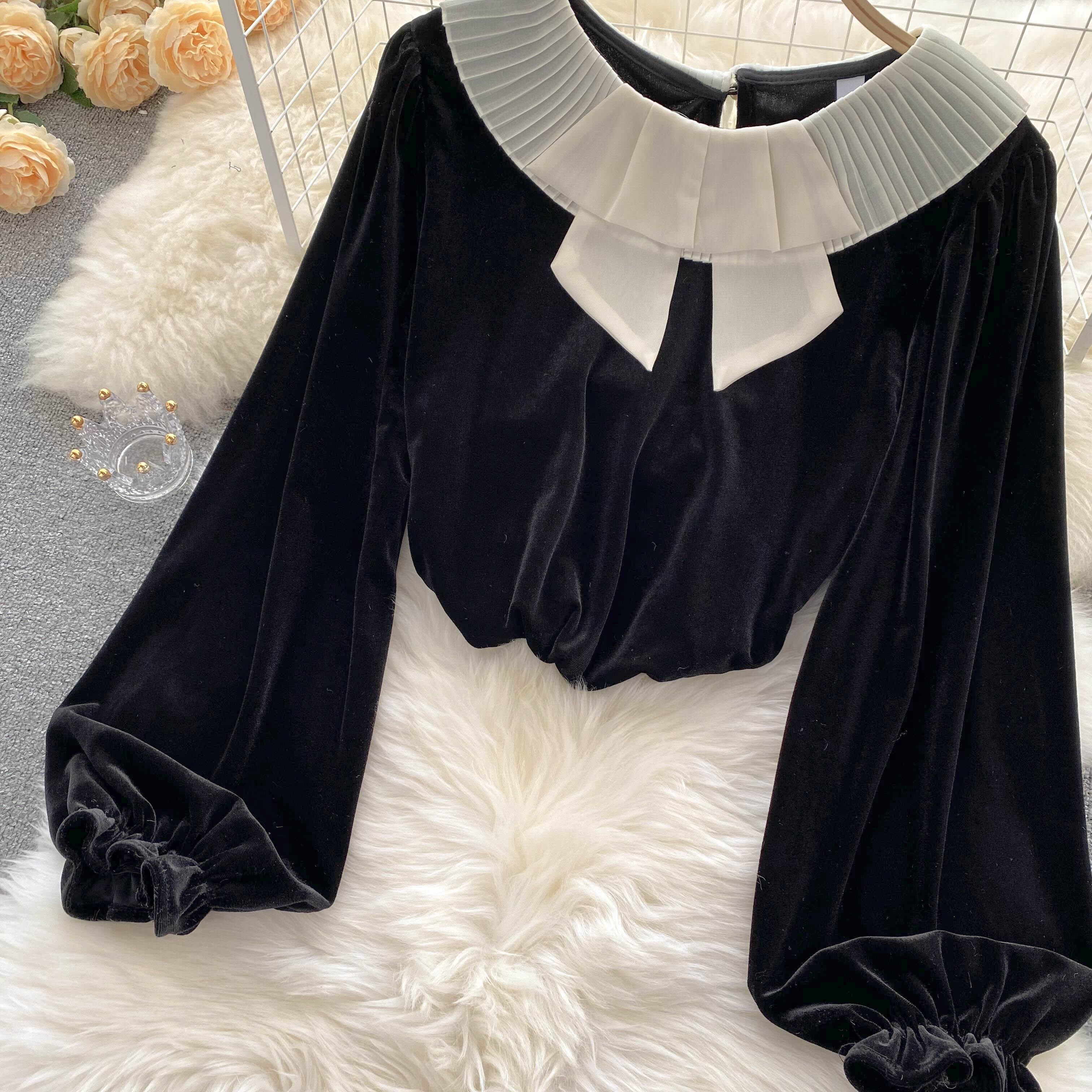 French retro black velvet shirt women's design sense minority contrast color doll collar Western style age-reducing puff sleeve top ブラック レトロ lyxaj48024704014