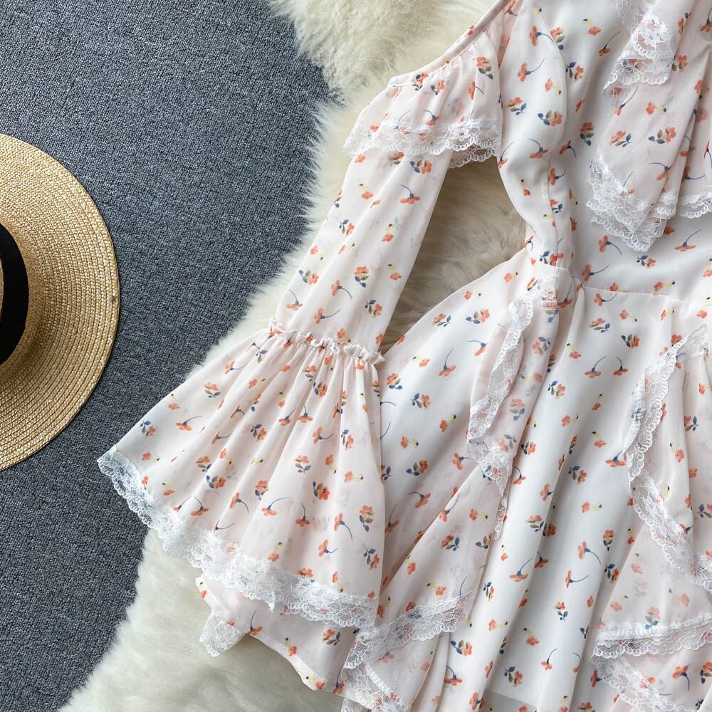 French gentle wind waist lady chiffon print dress hollow off shoulder temperament slim and sweet A-line skirt シフォン 大人ガーリー スウィート キュート カジュアル スカート Aライン スリム オフショルダー lyxaj44819461654