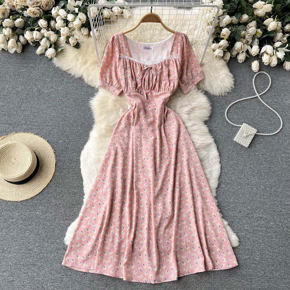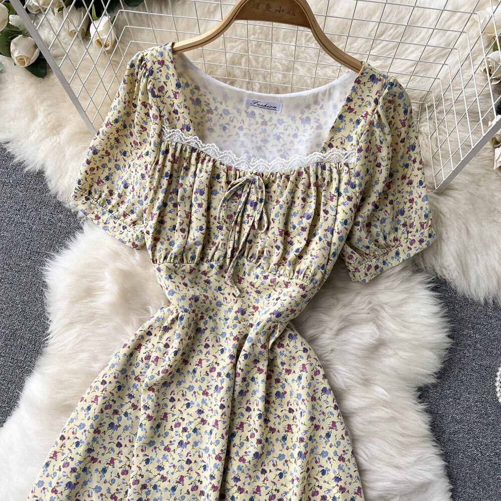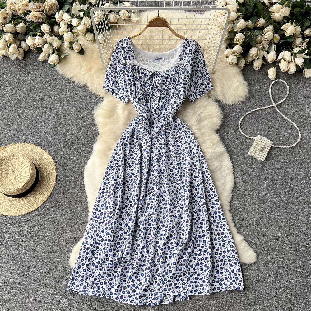 chic small fresh lace lace square neck floral dress female super fairy Sen light ripe waist a-line skirt レース 花柄 スカート Aライン スクウェア lyxaj83580342971