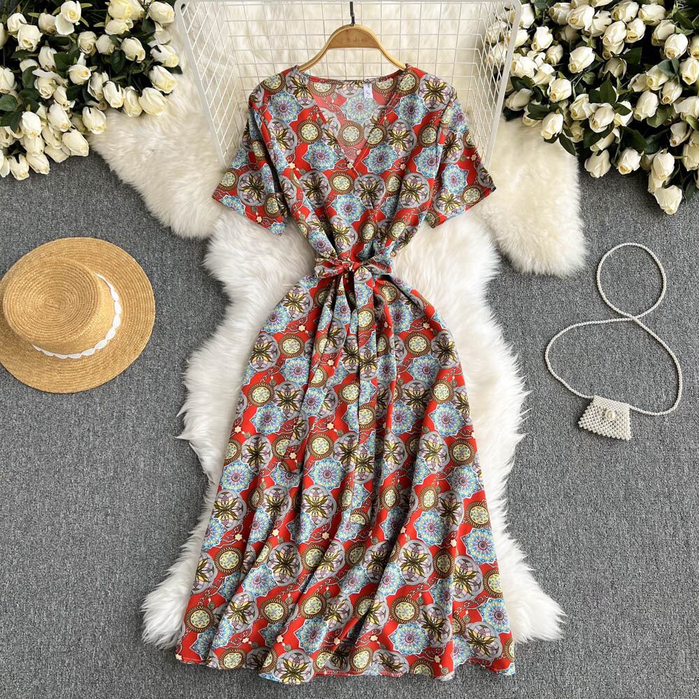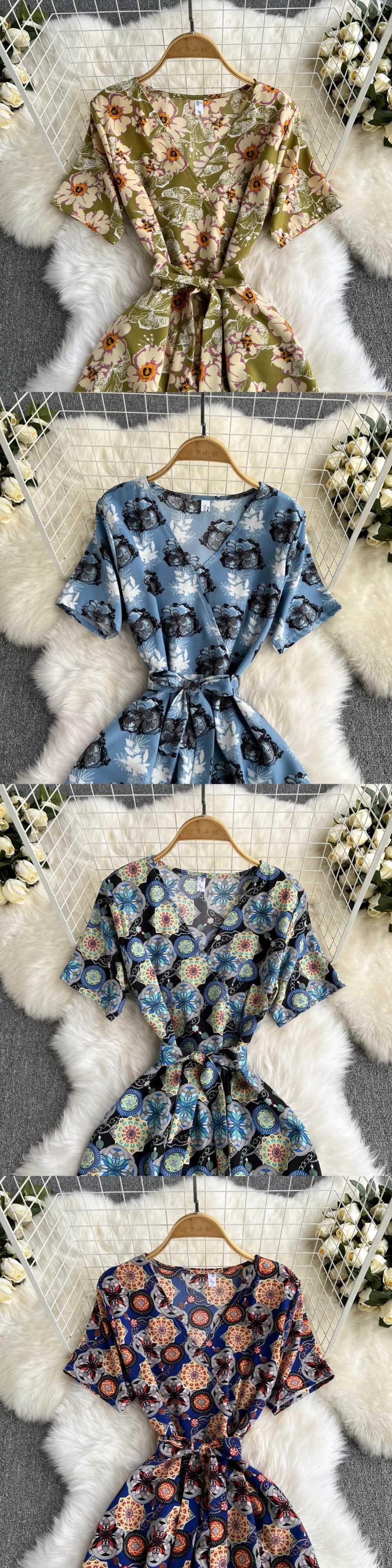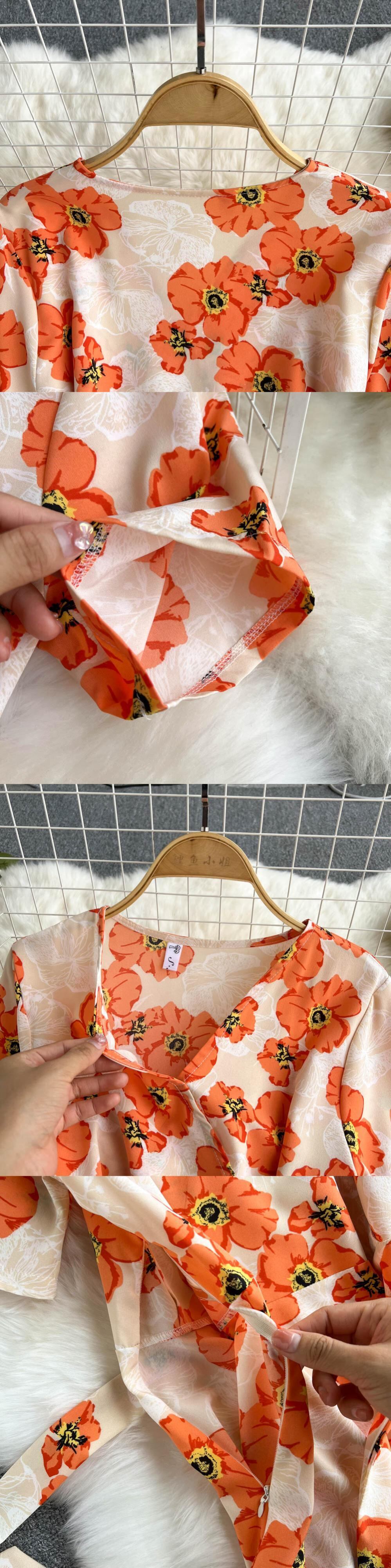 French romantic dress summer new temperament V-neck tie waist and thin mid-length floral bellflower skirt サマー 夏物 花柄 スカート Vネック フラワーデザイン lyxaj88539756791