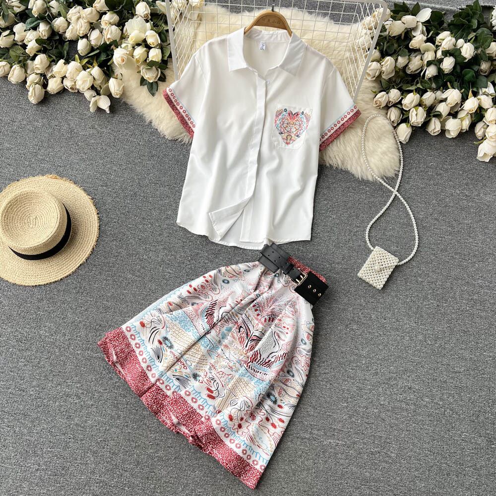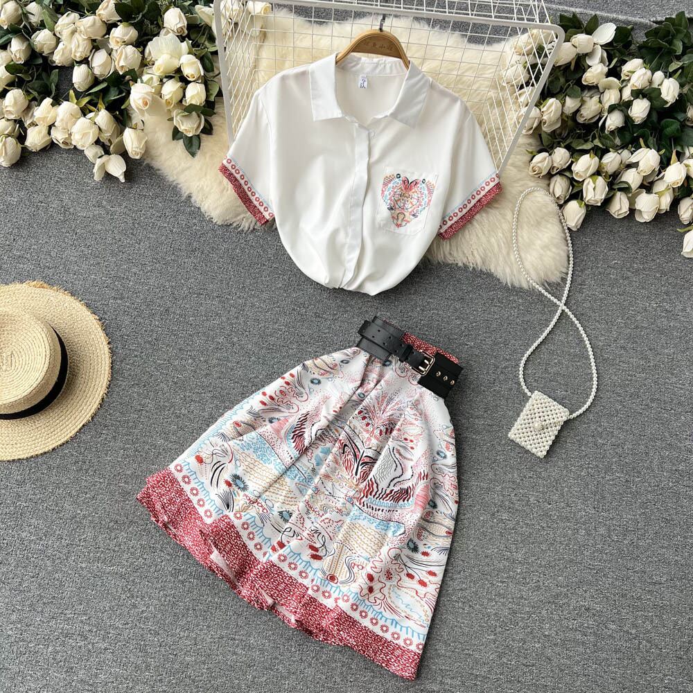 Retro Embroidered Print Doll Collar Style Suit Women's Short Sleeve Shirt + Small Pleated Skirt Two-piece Set ショート レッド レトロ 半袖 ハーフスリーブ 刺繍 プリーツ スカート lyxaj72152055305