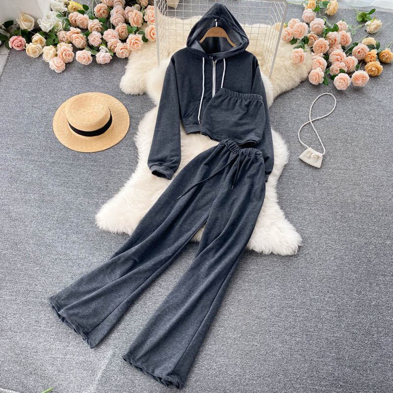 Sports suit women's 2021 autumn new tube top top zipper hooded sweater high waist wide leg pants three-piece set ハイウェスト オータム 秋物 ワイドレッグ ワイドパンツ lyxaj37940309370