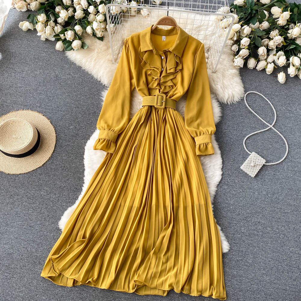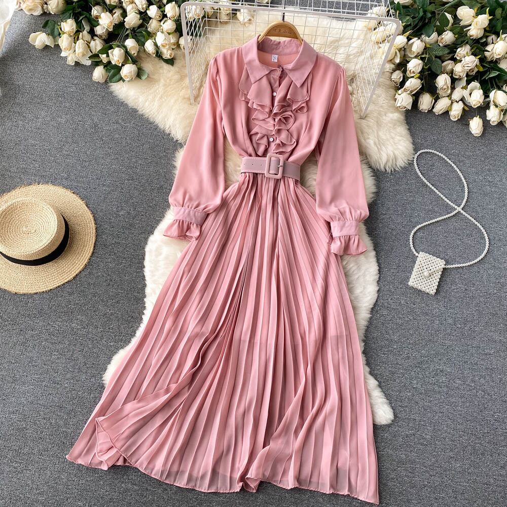 Celebrity elegant temperament chiffon dress female lace waist is thin polo collar ruffled pleated long skirt ロング シフォン レース エレガント プリーツ スカート lyxaj84360712215