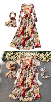 Full Garden Spring Spring Goddess Fan Temperament Round Neck Slim Long Print Chiffon Holiday Dress ロング シフォン スプリング 春物 Oネック スリム lyxaj90047750424