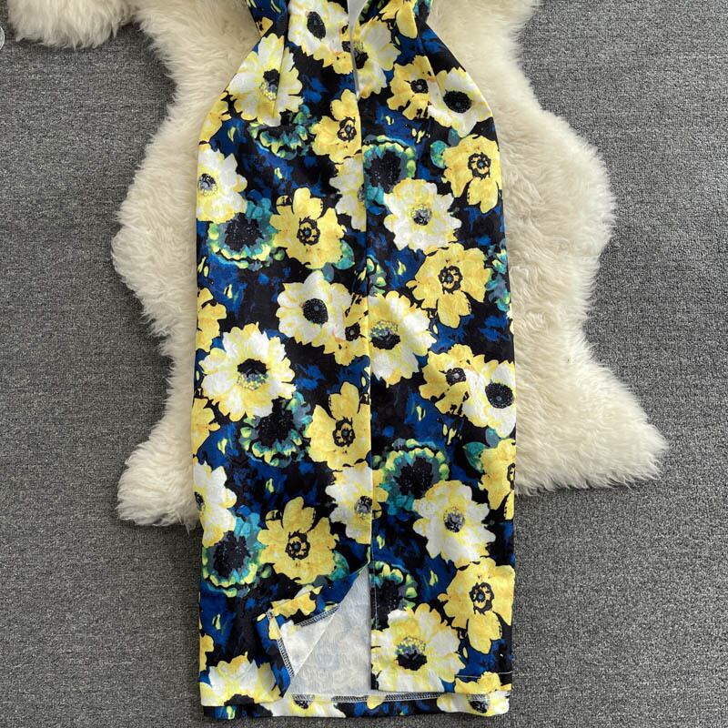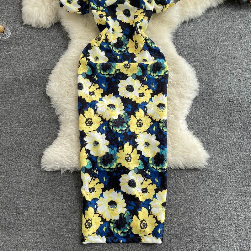 2021 short-sleeved fashionable temperament version flower print long slim fit slim sexy v-neck hip dress ロング Vネック スリム フラワーデザイン lyxaj70997802118