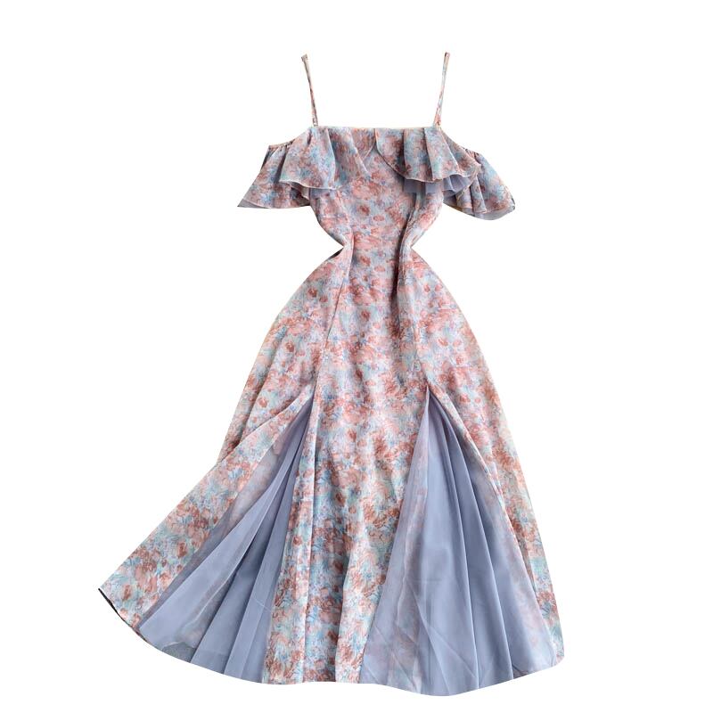 Seaside holiday dress waist summer new sexy one-word neck strapless suspenders slim mid-length chiffon dress シフォン サマー 夏物 スリム lyxaj47008203807
