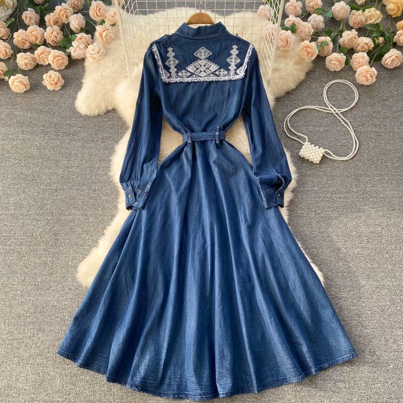 2022 spring French retro long dress Europe and the United States waist and thin long sleeves retro denim embroidery long dress ロング レトロ 長袖 刺繍 スプリング 春物 lyxaj73157902570