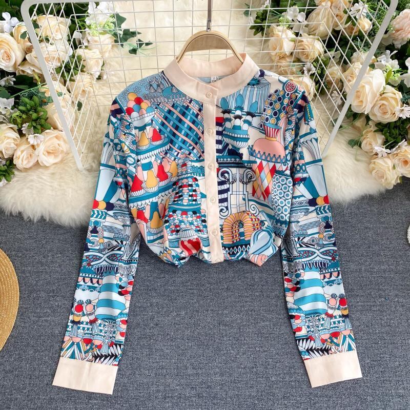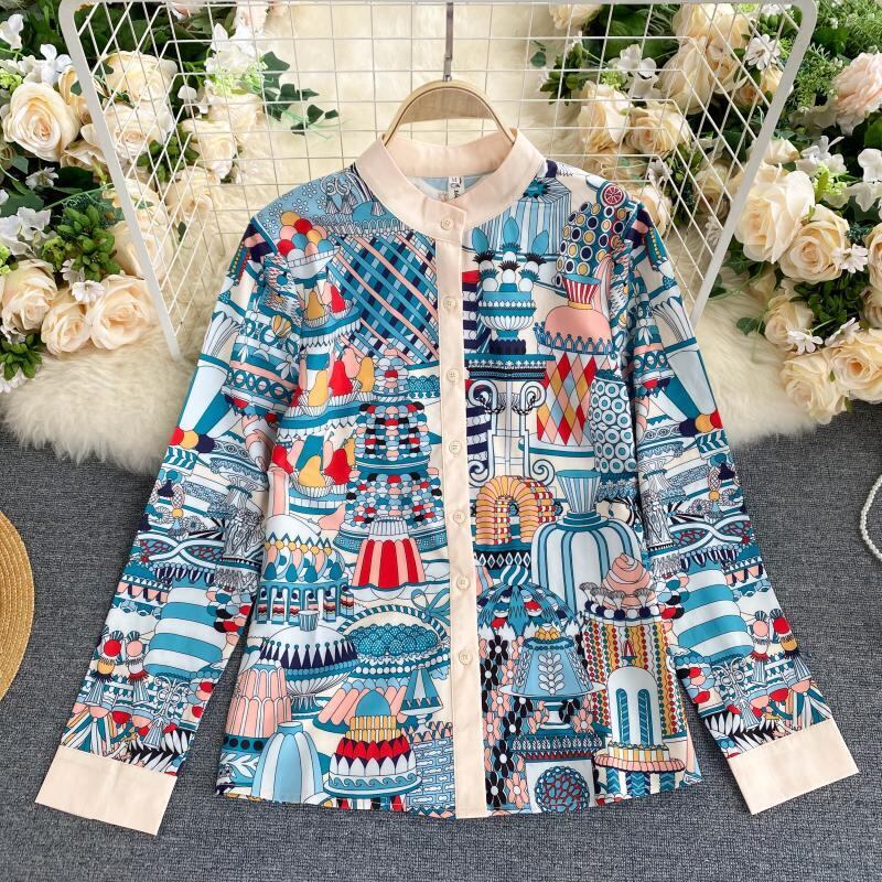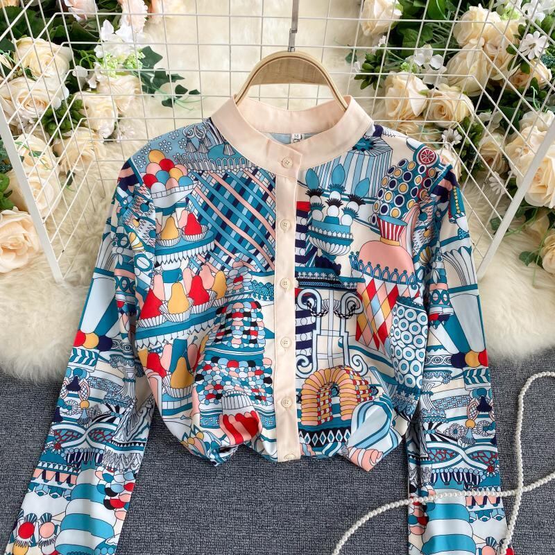 Celebrity temperament color matching small stand-up collar shirt women's design sense niche childlike print long-sleeved loose all-match top trendy ロング lyxaj61490624801