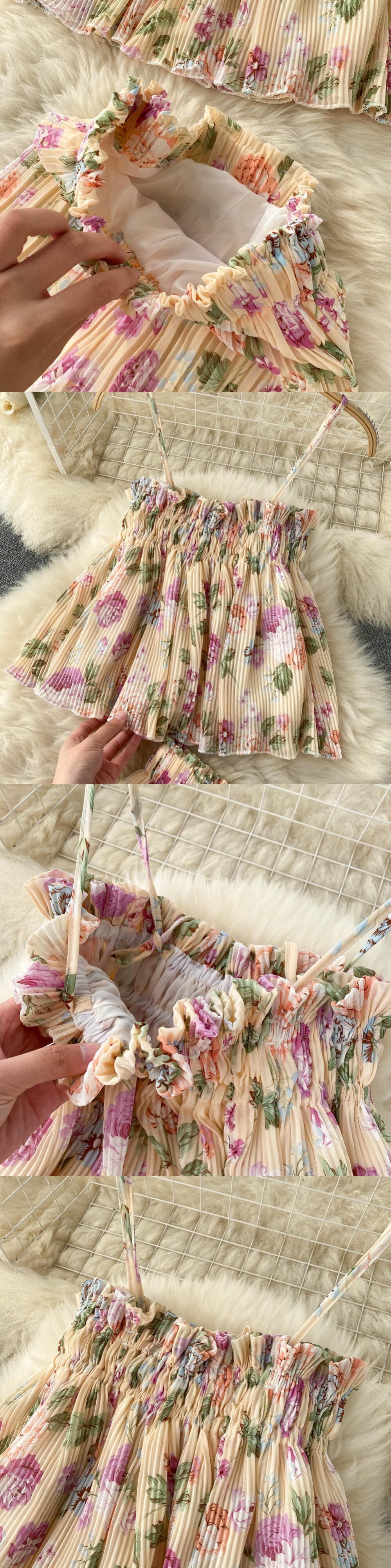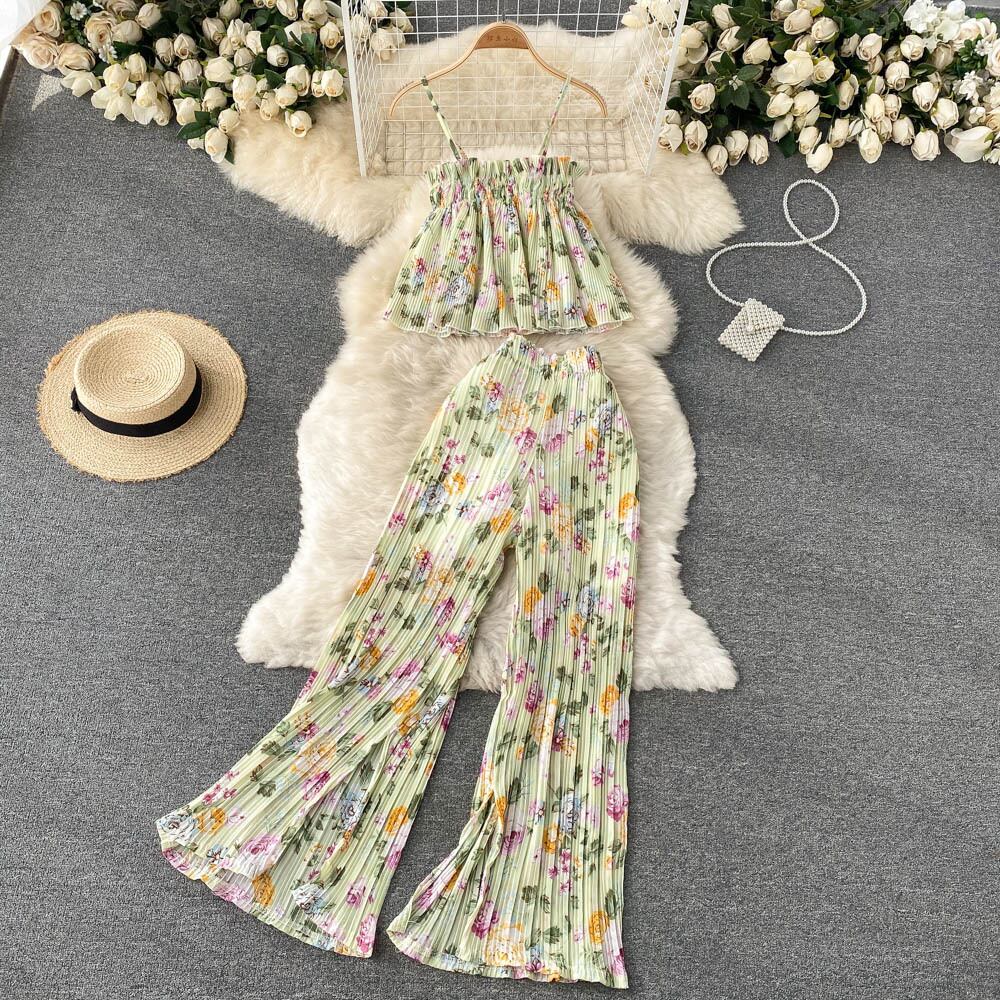 Temperament tube top suspender short top heavy industry pleated western style print high waist slit wide leg trousers two-piece suit ハイウェスト ショート プリーツ ワイドレッグ ワイドパンツ lyxaj56426685696