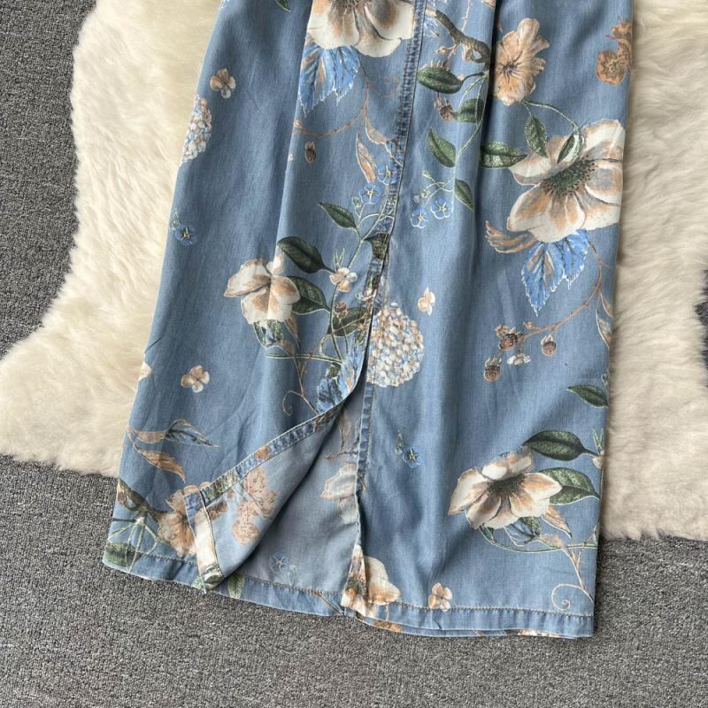 Feminine French retro print denim dress drawstring waist temperament mid-length package hip slit A-line skirt レトロ スカート Aライン lyxaj26550387204