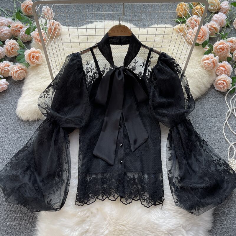 2021 early autumn new super fairy bow tie puff sleeve lace chiffon shirt mesh embroidery hollow top シフォン リボン レース 刺繍 オータム 秋物 メッシュ lyxaj77777711367