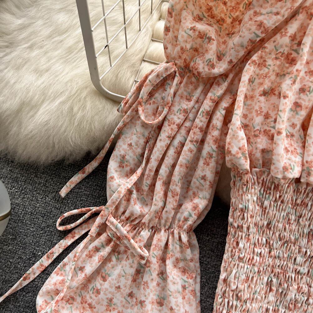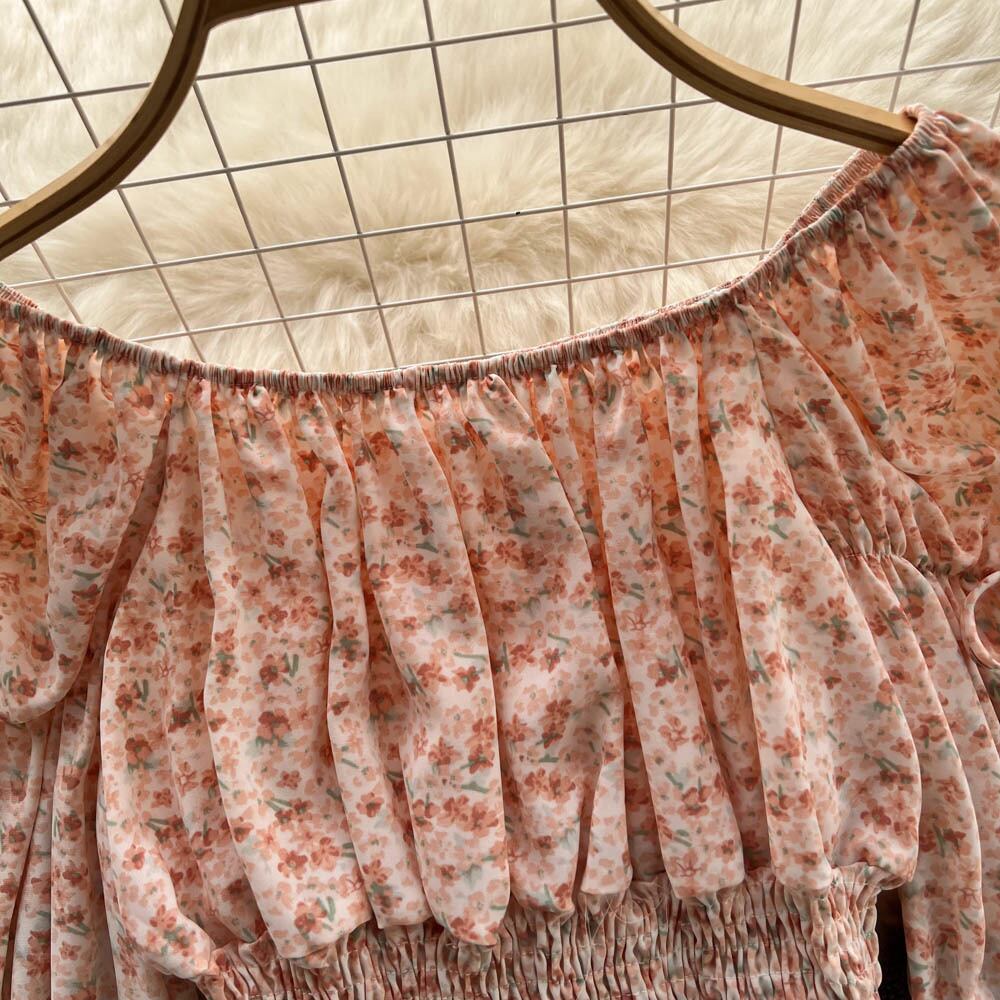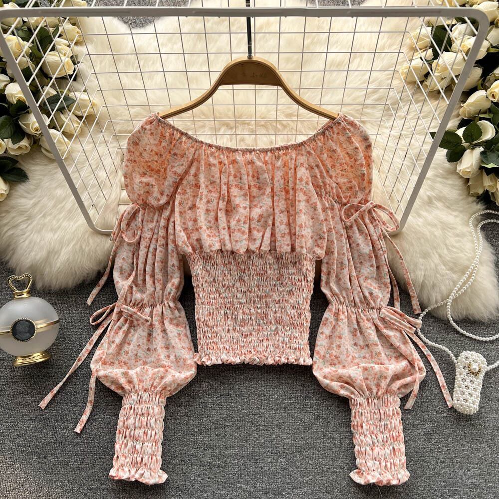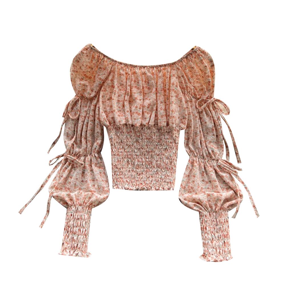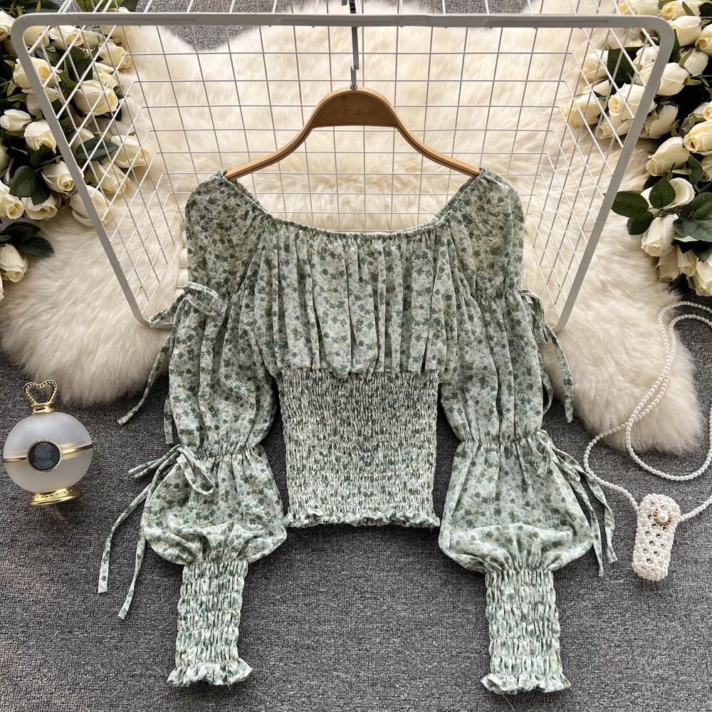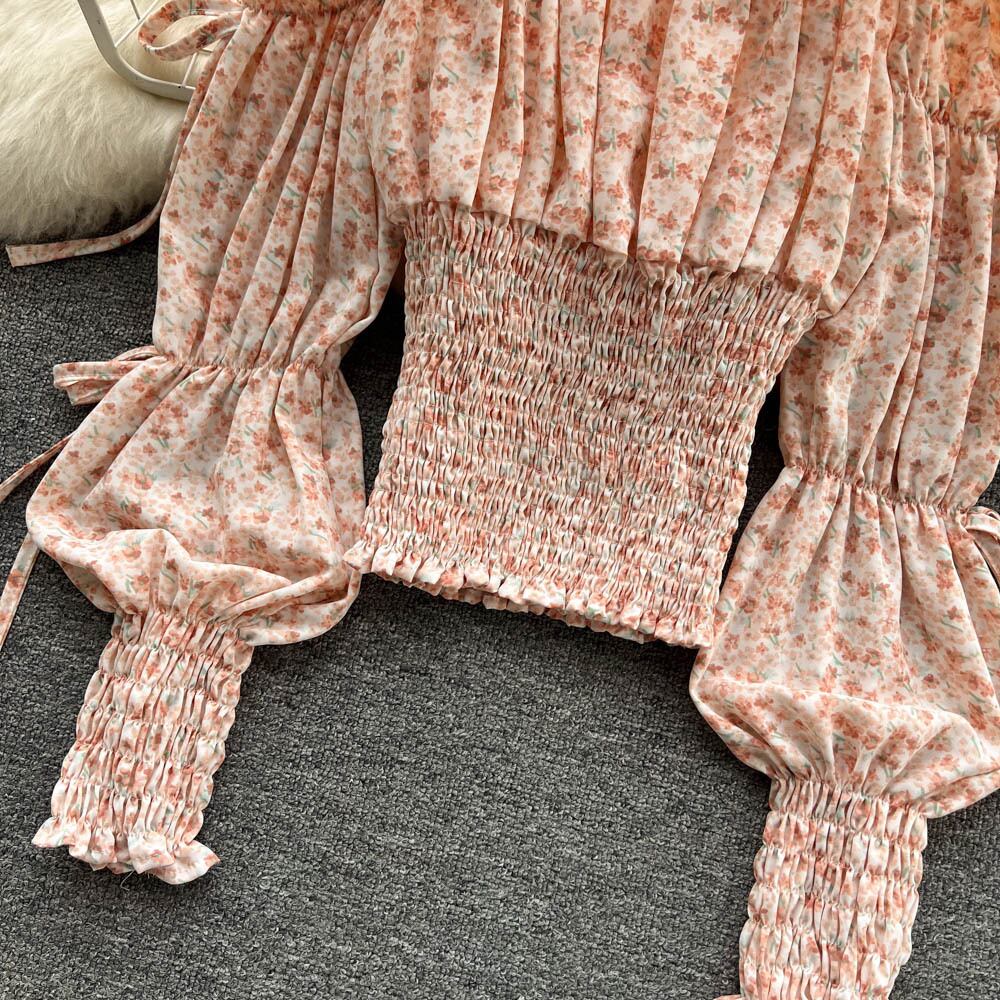 Spring Style Square Collar Pleated Drawstring Puff Sleeve Floral Shirt Women's One-word Shoulder Waist Thin Western Style Top Trendy プリーツ スプリング 春物 花柄 スクウェア lyxaj64948261216
