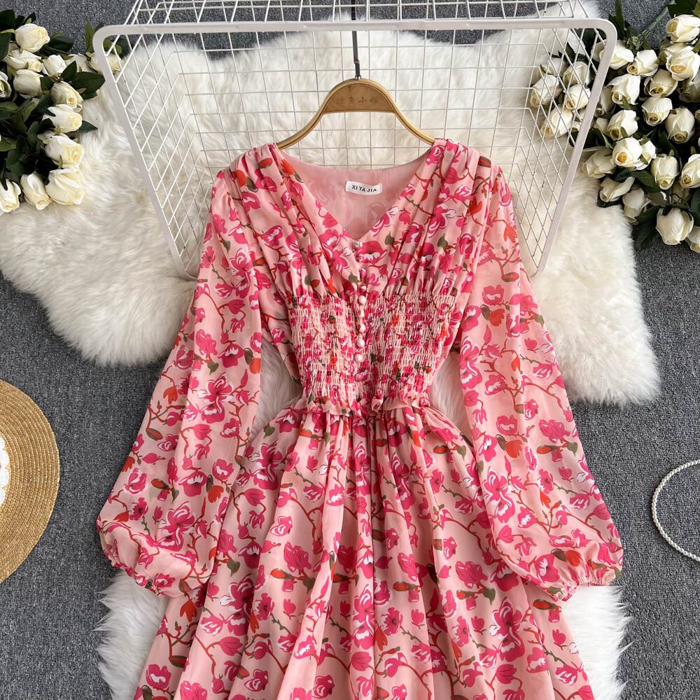 Chic super fairy French floral chiffon dress female temperament V-neck waist slimming seaside holiday big swing dress シフォン 花柄 Vネック lyxaj20902952453