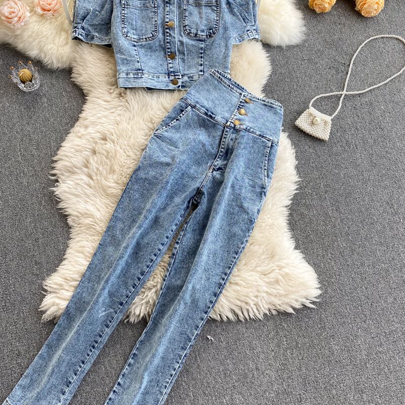 Hong Kong style retro motorcycle lapel short-sleeved denim top high waist slim slim long legs pencil pants two-piece women ハイウェスト ロング レトロ スリム lyxaj26745463719