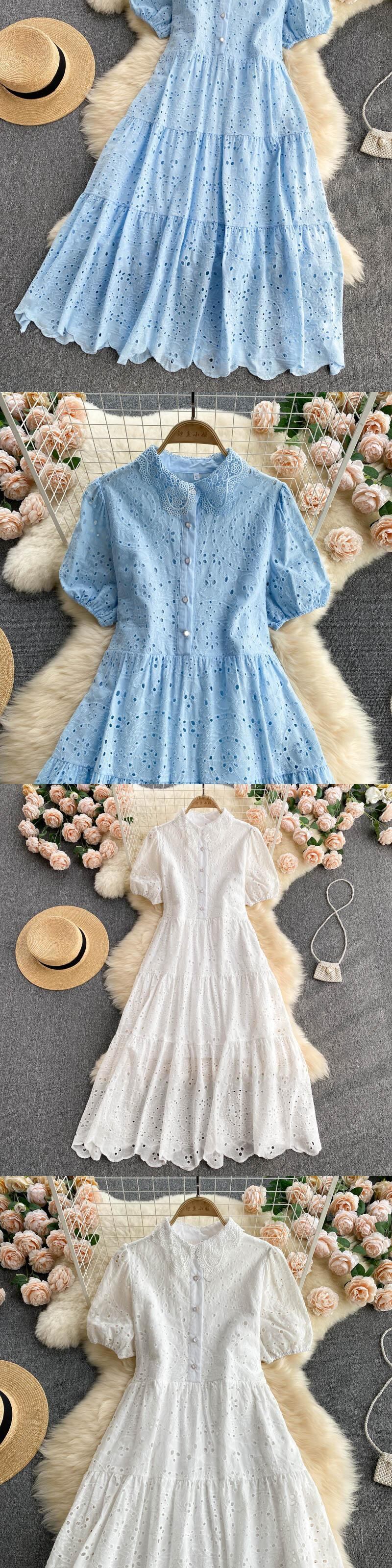 style dress summer new hollow embroidery age-reducing puff sleeves loose mid-length bohemian holiday dress 刺繍 サマー 夏物 lyxaj24581730237