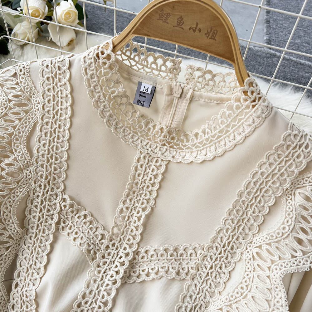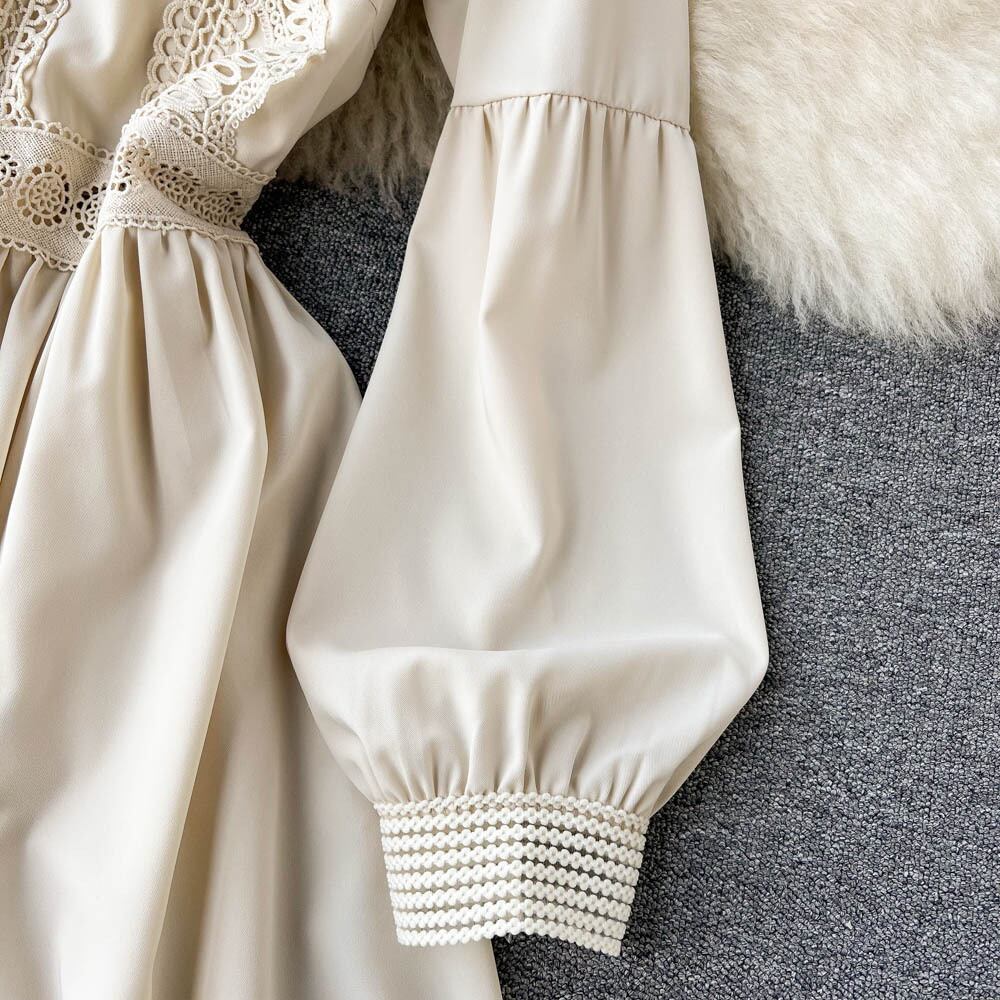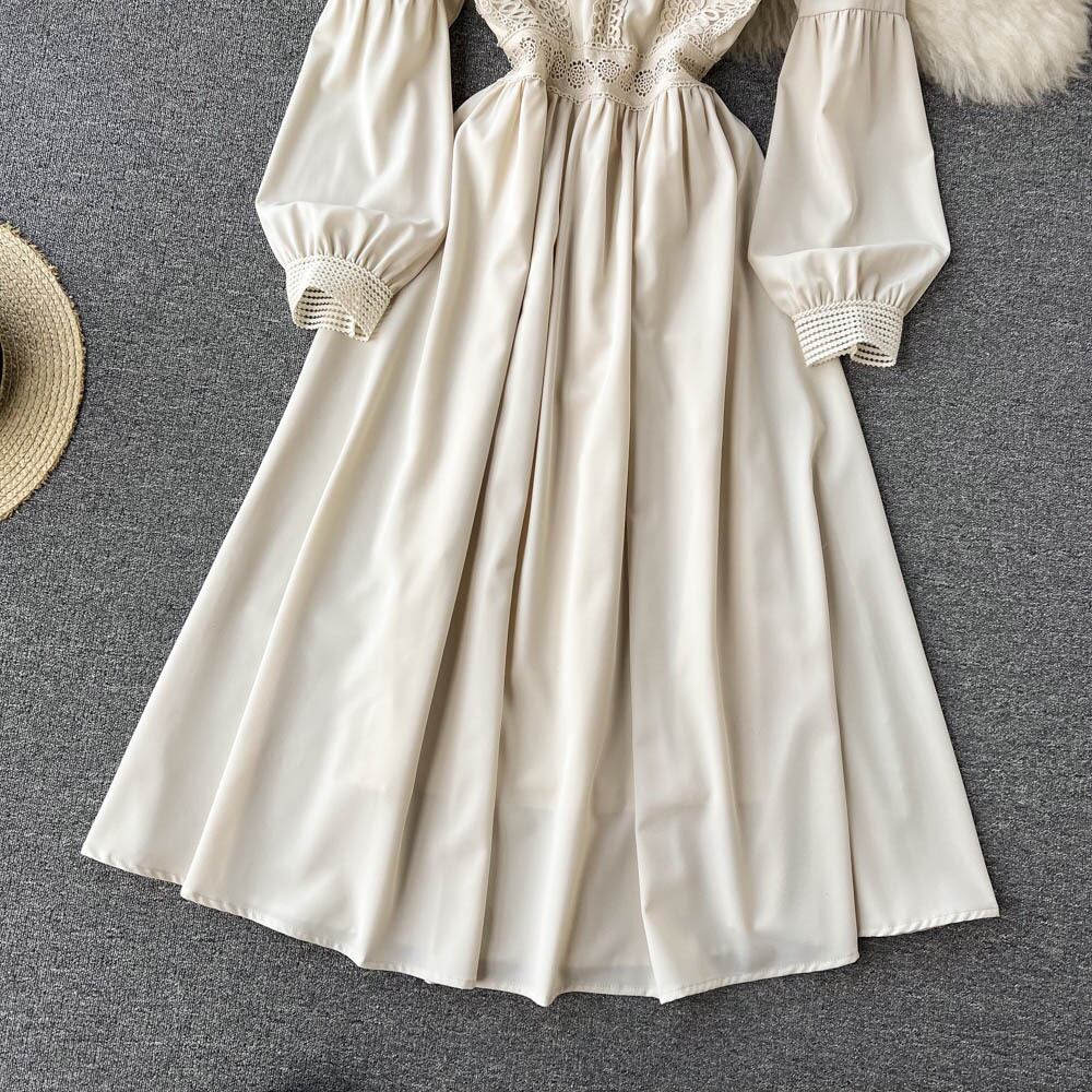 Spring French retro long-sleeved fungus lace dress with a sense of niche all-match loose bottom pleated skirt ロング レトロ レース プリーツ スプリング 春物 スカート lyxaj21913019357