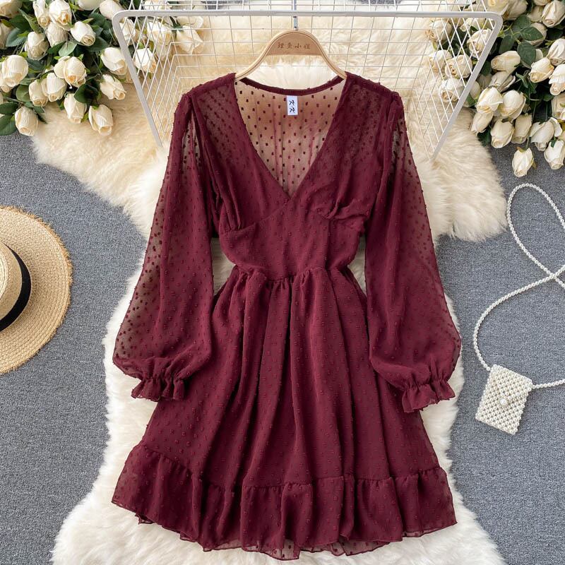 Autumn 2021 new women's European and American ins holiday style thin section sweet water jade polka dot chiffon dress women シフォン 大人ガーリー スウィート キュート カジュアル オータム 秋物 ジェード 翡翠 ヒスイ ヨーロピアン lyxaj77360035967